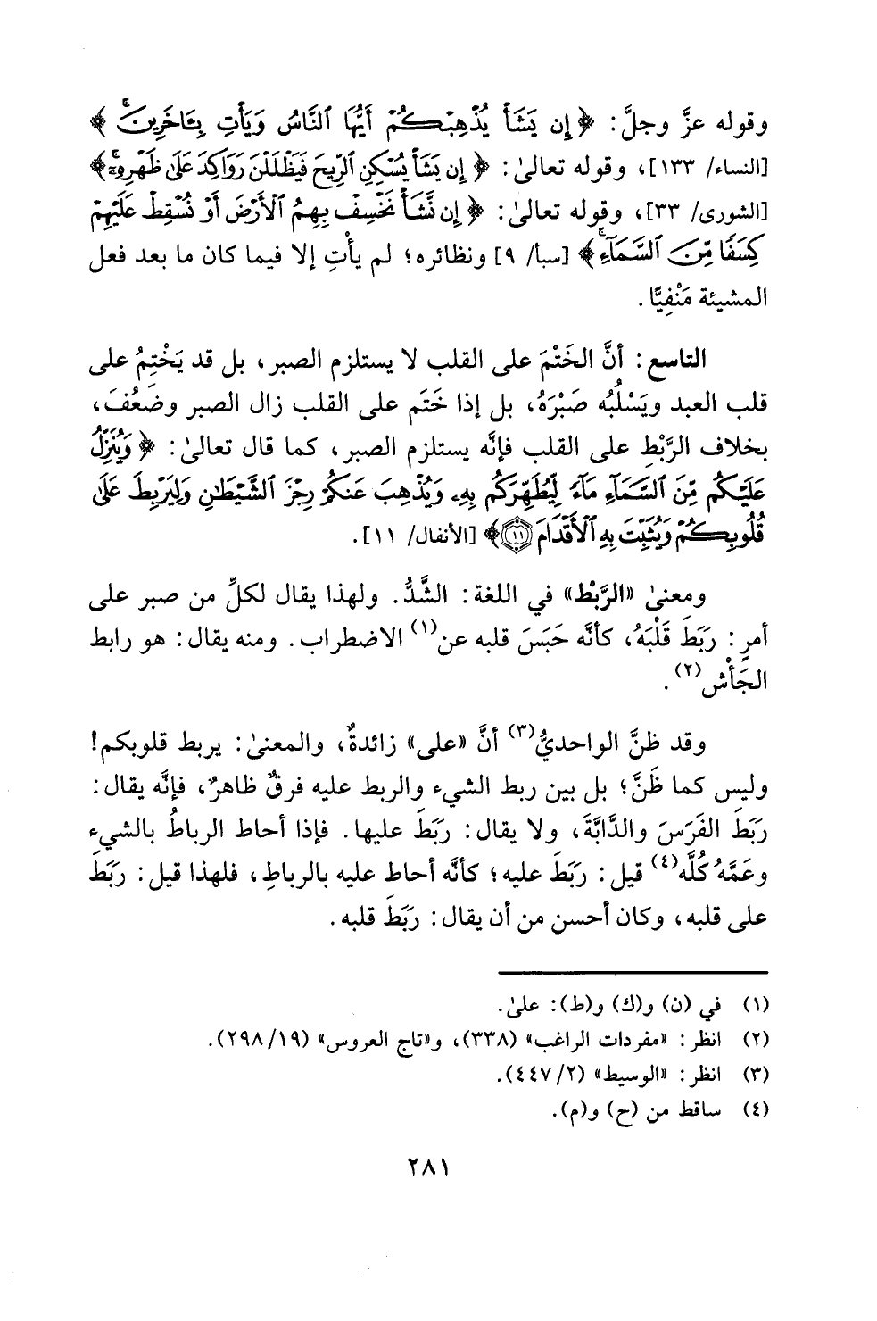 وقد ظنَّ الواحديُّ (¬3) أنَّ "على" زائدةٌ، والمعنى: يربط قلوبكم! وليس كما ظَنَّ؛ بل بين ربط الشيء والربط عليه فرقٌ ظاهرٌ، فإنَّه يقال: رَبَطَ الفَرَسَ والدَّابَّةَ، ولا يقال: رَبَطَ عليها. فإذا أحاط الرباطُ بالشيء وعَمَّهُ كُلَّه (¬4) قيل: رَبَطَ عليه؛ كأنَّه أحاط عليه بالرباطِ، فلهذا قيل: رَبَطَ على قلبه، وكان أحسن من أن يقال: رَبَطَ قلبه.
