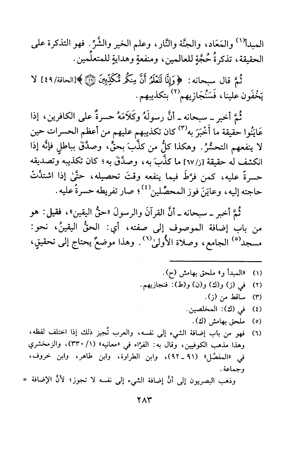ثُمَّ أخبر -سبحانه- أنَّ القرآنَ والرسولَ "حقُّ اليقين"، فقيل: هو من باب إضافة الموصوف إلى صفته، أي: الحقُّ اليقينُ، نحو: مسجد (¬5) الجامع، وصلاة الأُولي (¬6). وهذا موضعٌ يحتاج إلى تحقيقٍ،