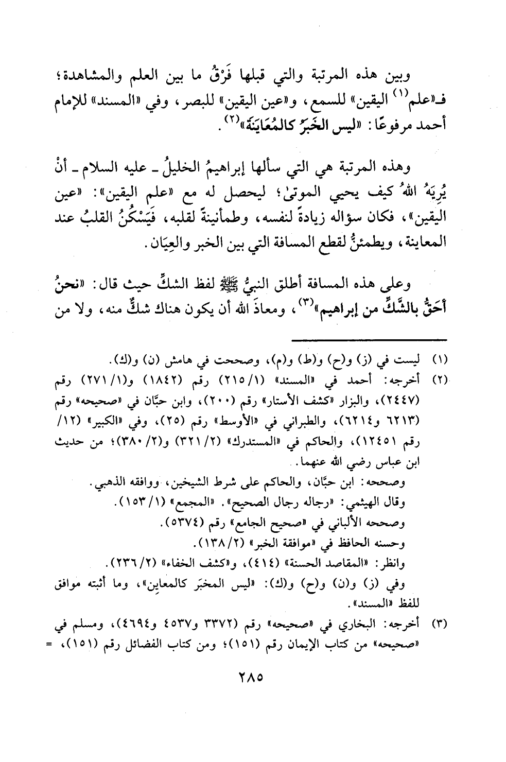وهذه المرتبة هي التي سألها إبراهيمُ الخليلُ -عليه السلام- أنْ يُرِيَهُ اللهُ كيف يحيي الموتى؛ ليحصل له مع "علم اليقين": "عين اليقين"، فكان سؤاله زيادةً لنفسه، وطمأنينةً لقلبه، فَيَسْكُنُ القلبُ عند المعاينة، ويطمئنُّ لقطع المسافة التي بين الخبر والعِيَان.