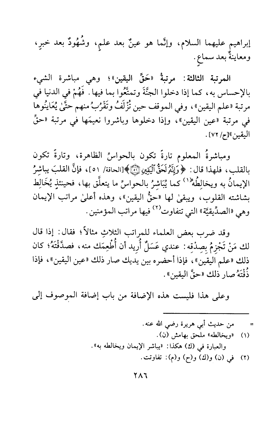 ومباشرةُ المعلوم تارةً تكون بالحواسِّ الظاهرة، وتارةً تكون بالقلب، فلهذا قال: {وَإِنَّهُ لَحَقُّ الْيَقِينِ (51)} [الحاقة: 51]، فإنَّ القلبَ يباشِرُ الإيمانُ به ويخالِطُهُ (¬1) كما يُبَاشِرُ بالحواسِّ ما يتعلَّق بها، فحينئذٍ يُخَالِط بشاشته القلوب، ويبقى لها "حقُّ اليقين"، وهذه أعلى مراتب الإيمان وهي "الصدِّيقيَّة" التي تتفاوت (¬2) فيها مراتب المؤمنين.