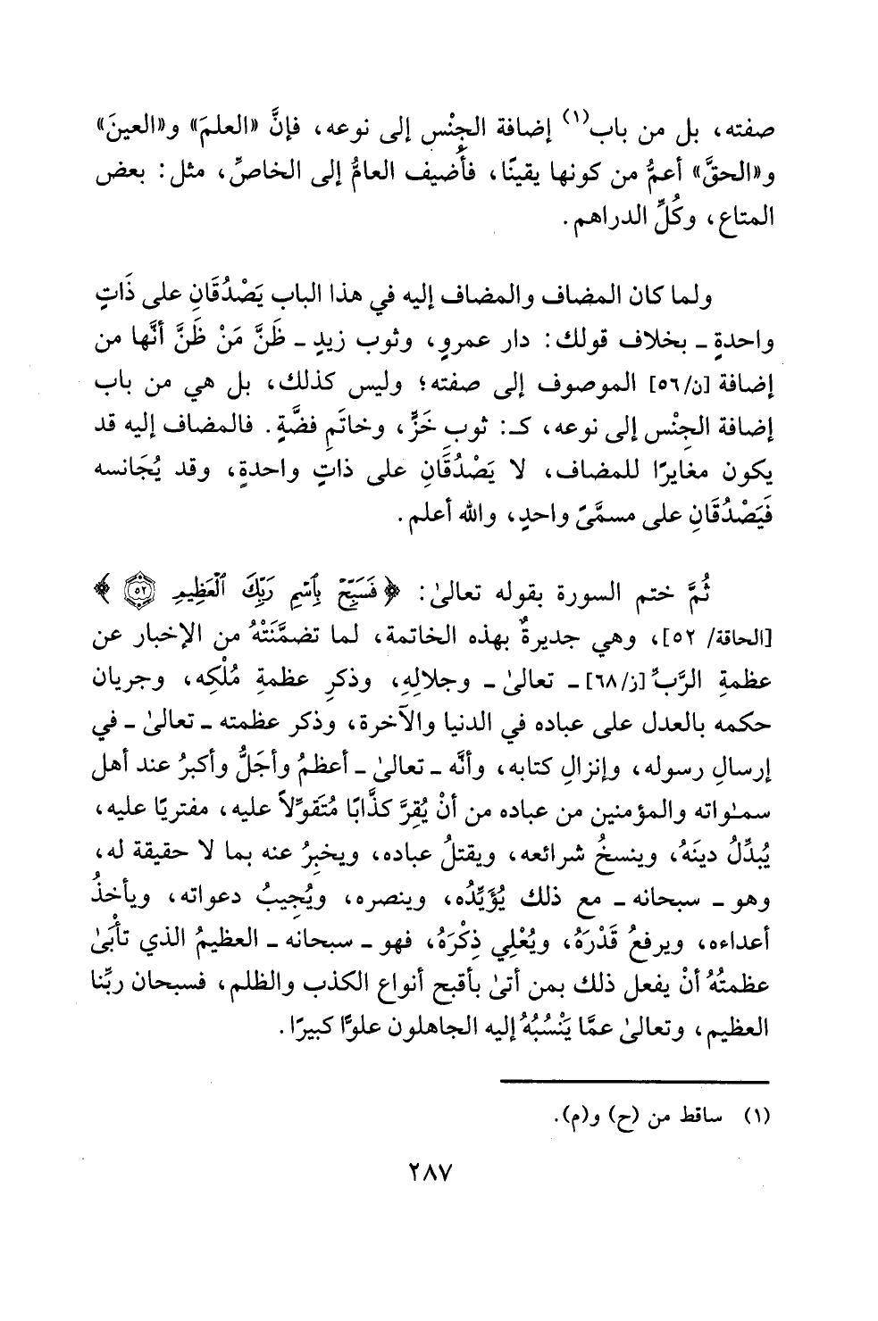 ولما كان المضاف والمضاف إليه في هذا الباب يَصْدُقَانِ على ذَاتٍ واحدةٍ -بخلاف قولك: دار عمروٍ، وثوب زيدٍ- ظَنَّ مَنْ ظَنَّ أنَّها من إضافة الموصوف إلى صفته؛ وليس كذلك، بل هي من باب إضافة الجنْس إلى نوعه، كـ: ثوب خَزٍّ، وخاتَمِ فضَّةٍ. فالمضاف إليه قد يكون مغَايرًا للمضاف، لا يَصْدُقانِ على ذاتٍ واحدةٍ، وقد يُجَانسه فَيَصْدُقَانِ على مسمَّىً واحدٍ، والله أعلم.