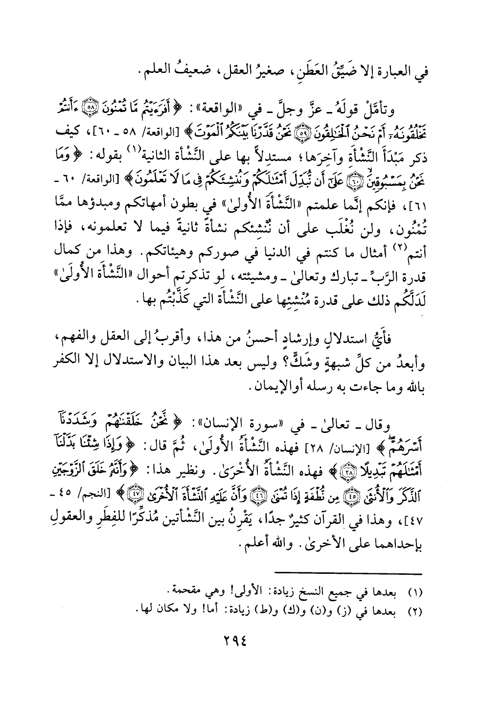 وقال -تعالى- فى "سورة الإنسان": {نَحْنُ خَلَقْنَاهُمْ وَشَدَدْنَا أَسْرَهُمْ} [الإنسان: 28] فهذه النَّشأة الأُولى، ثُمَّ قال: {وَإِذَا شِئْنَا بَدَّلْنَا أَمْثَالَهُمْ تَبْدِيلًا (28)} فهذه النَّشْأةُ الأُخْرَى. ونظير هذا: {وَأَنَّهُ خَلَقَ الزَّوْجَيْنِ الذَّكَرَ وَالْأُنْثَى (45) مِنْ نُطْفَةٍ إِذَا تُمْنَى (46) وَأَنَّ عَلَيْهِ النَّشْأَةَ الْأُخْرَى (47)} [النجم: 45 - 47]، وهذا في القرآن كثيرٌ جدًا، يَقْرِنُ بين النَّشْأتين مُذكِّرًا للفِطَرِ والعقولِ بإحداهما على الأخرى. والله أعلم.