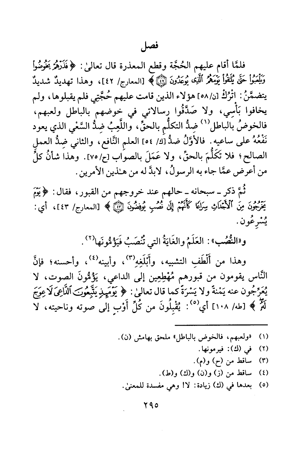 فلمَّا أقام عليهم الحُجَّة وقطع المعذرة قال تعالى: {فَذَرْهُمْ يَخُوضُوا وَيَلْعَبُوا حَتَّى يُلَاقُوا يَوْمَهُمُ الَّذِي يُوعَدُونَ (42)} [المعارج: 42]، وهذا تهديدٌ شديدٌ يتضمَّنُ: اتْرُكْ هؤلاء الذين قامت عليهم حُجَّتِي فلم يقبلوها، ولم يخافوا بَأْسِي، ولا صَدَّقُوا رسالاتي في خوضهم بالباطل ولعبهم، فالخوضُ بالباطل (¬1) ضِدُّ التكلُّمِ بالحقِّ، واللَّعِبُ ضِدُّ السَّعْي الذي يعود نَفْعُهُ على ساعيه. فالأوَّلُ ضدُّ العلمِ النَّافع، والثاني ضِدُّ العملِ الصالح؛ فلا تَكَلَّمَ بالحقِّ، ولا عَمَلَ بالصواب. وهذا شأنُ كلِّ من أعرض عمَّا جاء به الرسولُ، لابدَّ له من هذين الأمرين.