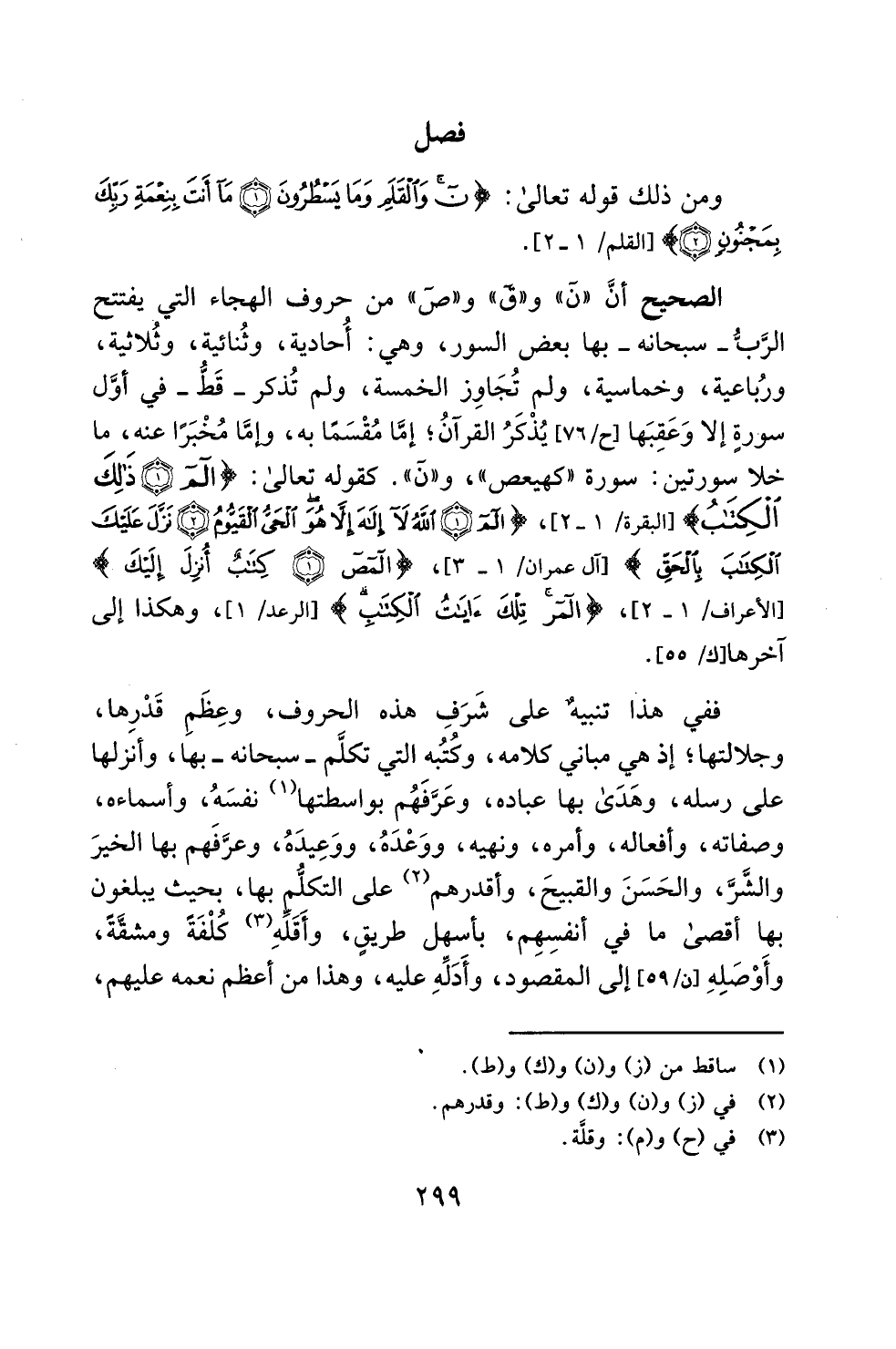 ففي هذا تنبيهٌ على شَرَفِ هذه الحروف، وعِظَمِ قَدْرِها، وجلالتها؛ إذ هي مباني كلامه، وكُتُبه التي تكلَّم -سبحانه- بها، وأَنزلها على رسله، وهَدَى بها عباده، وعَرَّفَهُم بواسطتها (¬1) نفسَهُ، وأسماءه، وصفاته، وأفعاله، وأمره، ونهيه، ووَعْدَهُ، ووَعِيدَهُ، وعرَّفَهم بها الخيرَ والشَّرَّ، والحَسَنَ والقبيحَ، وأقدرهم (¬2) على التكلُّم بها، بحيث يبلغون بها أقصى ما في أنفسِهِم، بأسهل طريقٍ، وأَقَلِّهِ (¬3) كُلْفَةً ومشقَّةً، وأَوْصَلِهِ إلى المقصود، وأَدَلِّهِ عليه، وهذا من أعظم نعمه عليهم،