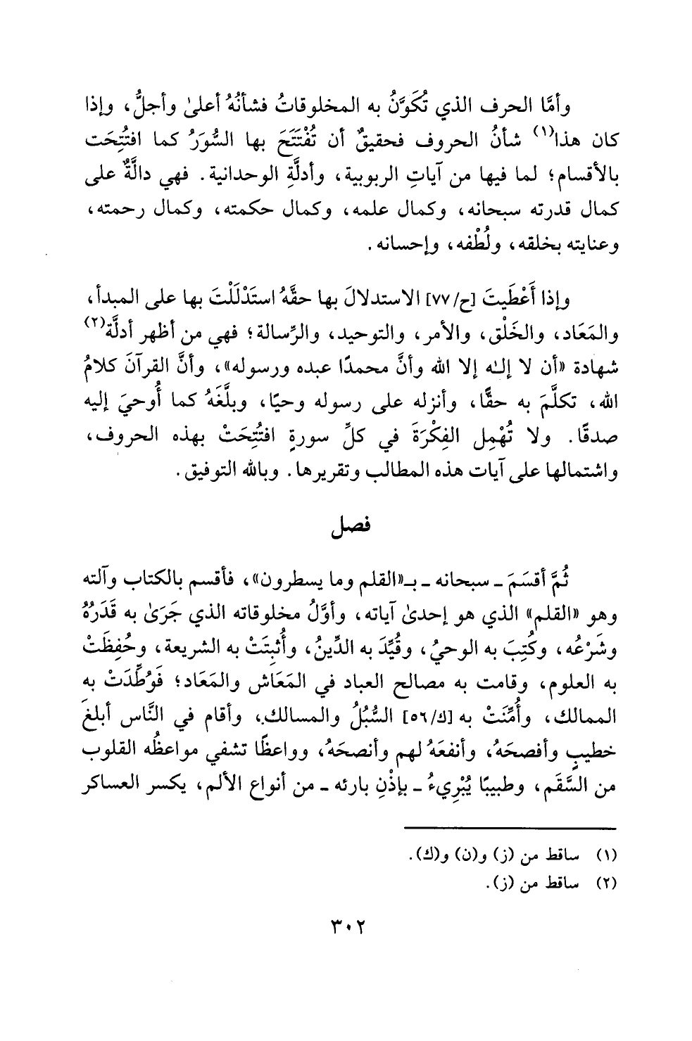 وإذا أَعْطَيتَ الاستدلالَ بها حقَّهُ استَدْلَلْتَ بها على المبدأ، والمَعَاد، والخَلْق، والأمر، والتوحيد، والرِّسالة؛ فهي من أظهر أدلَّة (¬2) شهادة "أن لا إله إلا الله وأنَّ محمدًا عبده ورسوله"، وأنَّ القرآنَ كلامُ الله، تكلَّمَ به حقًّا، وأنزله على رسوله وحيًا، وبلَّغَهُ كما أُوحيَ إليه صدقًا. ولا تُهْمِل الفِكْرَةَ في كلِّ سورةٍ افتُتِحَتْ بهذه الحروف، واشتمالها على آيات هذه المطالب وتقريرها. وبالله التوفيق.