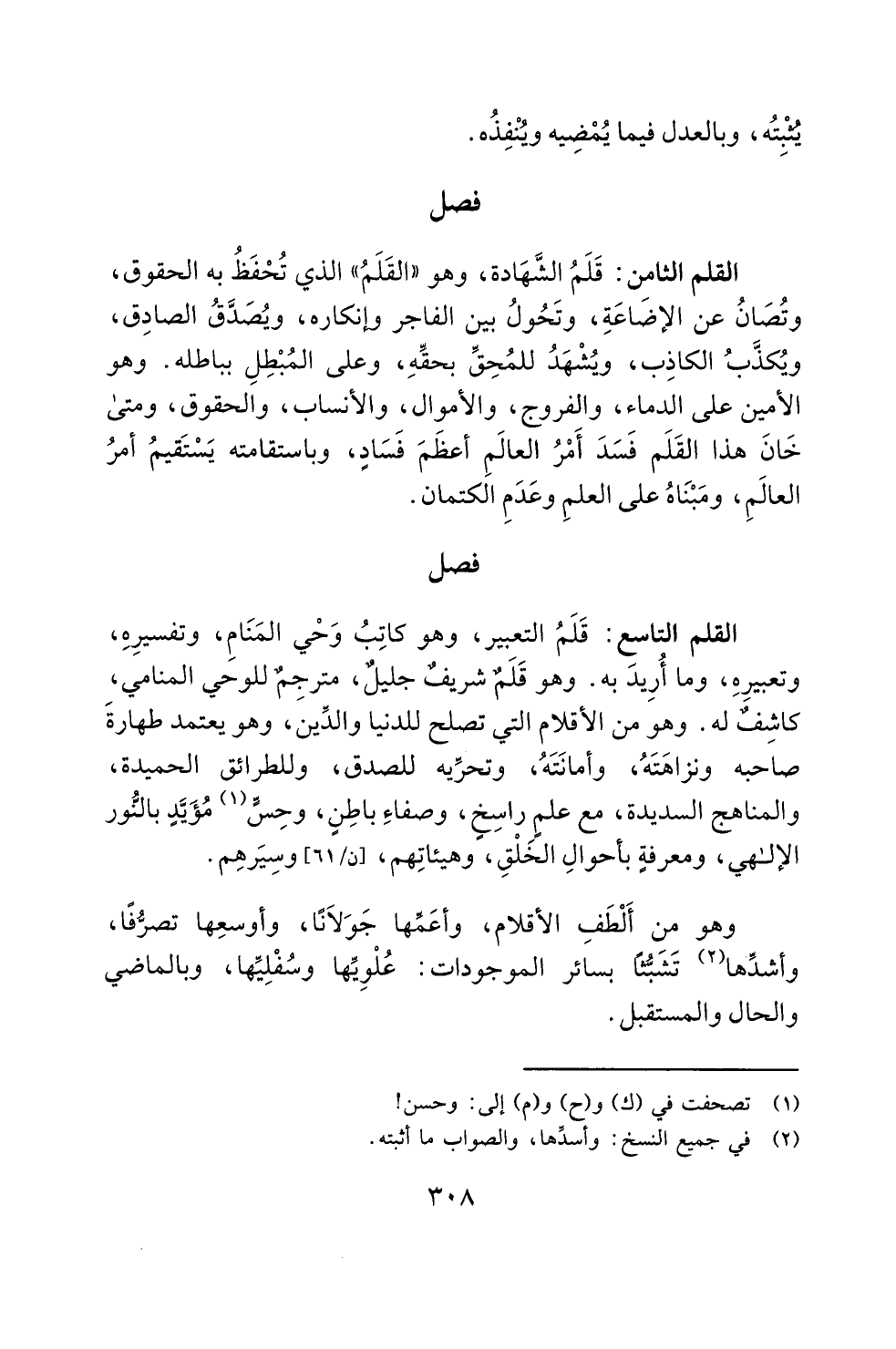 القلم الثامن: قَلَمُ الشَّهَادة، وهو "القَلَمُ" الذي تُحْفَظُ به الحقوق، وتُصَانُ عن الإضَاعَةِ، وتَحُولُ بين الفاجر وإنكاره، ويُصَدَّقُ الصادِق، ويُكذَّبُ الكاذِب، ويُشْهَدُ للمُحِقِّ بحقِّهِ، وعلى المُبْطِلِ بباطله. وهو الأمين على الدماء، والفروج، والأموال، والأنساب، والحقوق، ومتى خَانَ هذا القَلَم فَسَدَ أَمْرُ العالَمِ أعظَمَ فَسَادٍ، وباستقامته يَسْتَقيمُ أمرُ العالَمِ، ومَبْنَاهُ على العلمِ وعَدَمِ الكتمان.