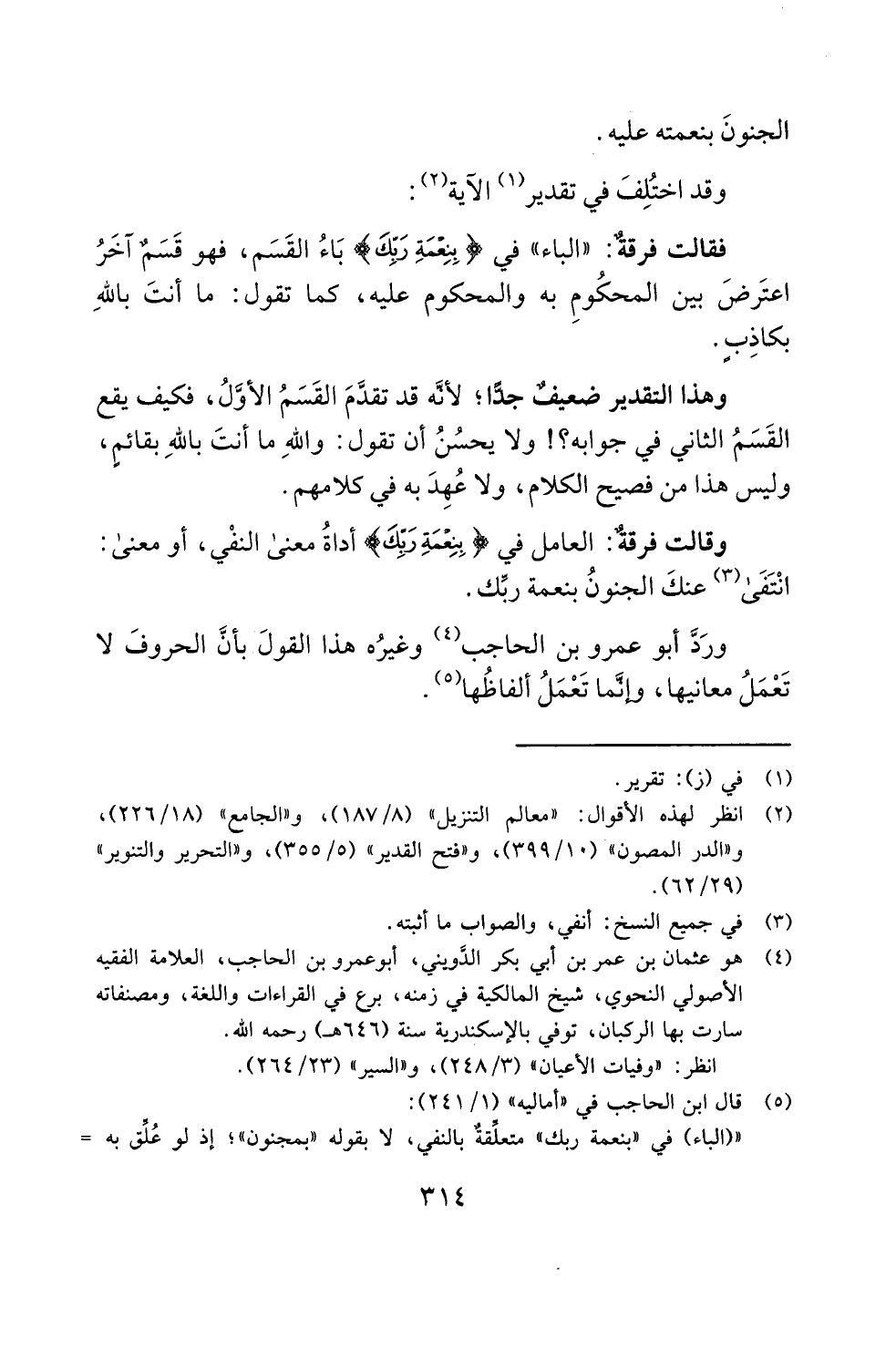 " (الباء) في "بنعمة ربك" متعلِّقةٌ بالنفي، لا بقوله "بمجنون"؛ إذ لو عُلِّق به =