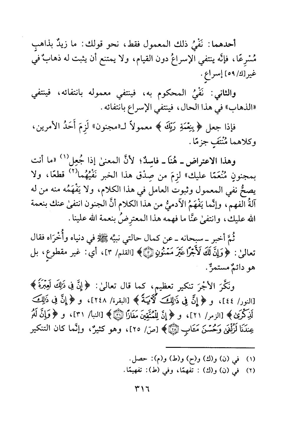 وهذا الاعتراض -هُنا- فاسِدٌ؛ لأنَّ المعنى إذا جُعِل (¬1) "ما أنت بمجنونٍ مُنْعَمًا عليك" لزِمَ من صِدْق هذا الخبر نَفْيُهُما (¬2) قطعًا، ولا يصحُّ نفي المعمول وثبوت العامل في هذا الكلام، ولا يَفْهَمُه منه من له آلةُ الفهم، وإنَّما يَفْهَمُ الآدميُّ من هذا الكلام أنَّ الجنون انتفى عنك بنعمة الله عليك، وانتفى عنَّا ما فهمه هذا المعترِضُ بنعمة الله علينا.