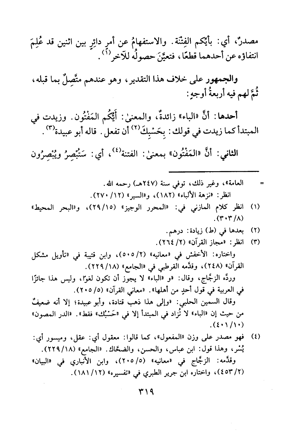 أحدها: أنَّ "الباء" زائدةٌ، والمعنى: أَيُّكُم المَفْتُون. وزيدت في المبتدأ كما زيدت في قولك: بِحَسْبِكَ (¬2) أن تفعل. قاله أبو عبيدة (¬3).