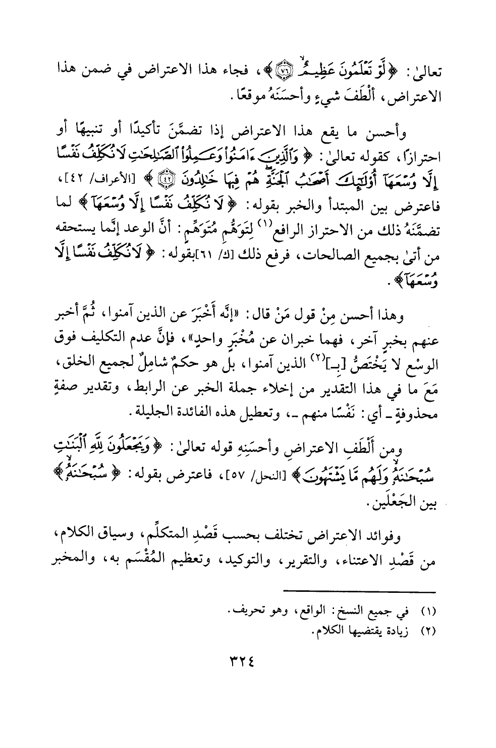 وأحسن ما يقع هذا الاعتراض إذا تضمَّنَ تأكيدًا أو تنبيهًا أو احترازًا، كقوله تعالى: {وَالَّذِينَ آمَنُوا وَعَمِلُوا الصَّالِحَاتِ لَا نُكَلِّفُ نَفْسًا إِلَّا وُسْعَهَا أُولَئِكَ أَصْحَابُ الْجَنَّةِ هُمْ فِيهَا خَالِدُونَ (42)} [الأعراف: 42]، فاعترض بين المبتدأ والخبر بقوله: {لَا نُكَلِّفُ نَفْسًا إِلَّا وُسْعَهَا} لما تضمَّنَهُ ذلك من الاحتراز الرافع (¬1) لِتَوَهُّمِ مُتَوَهِّمٍ: أنَّ الوعد إنَّما يستحقه من أتى بجميع الصالحات، فرفع ذلك بقوله: {لَا نُكَلِّفُ نَفْسًا إِلَّا وُسْعَهَا}.