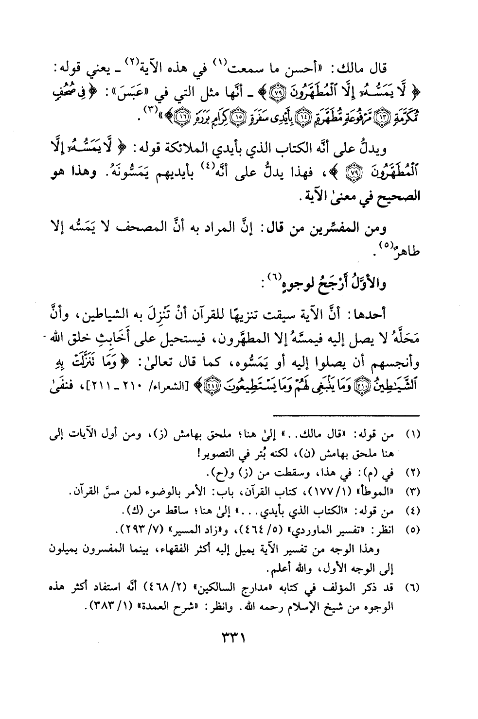 قال مالك: "أحسن ما سمعت (¬1) في هذه الآية (¬2) -يعني قوله: {لَا يَمَسُّهُ إِلَّا الْمُطَهَّرُونَ (79)} - أنها مثل التي في "عَبَسَ": {فِي صُحُفٍ مُكَرَّمَةٍ (13) مَرْفُوعَةٍ مُطَهَّرَةٍ (14) بِأَيْدِي سَفَرَةٍ (15) كِرَامٍ بَرَرَةٍ (16)} (¬3).
