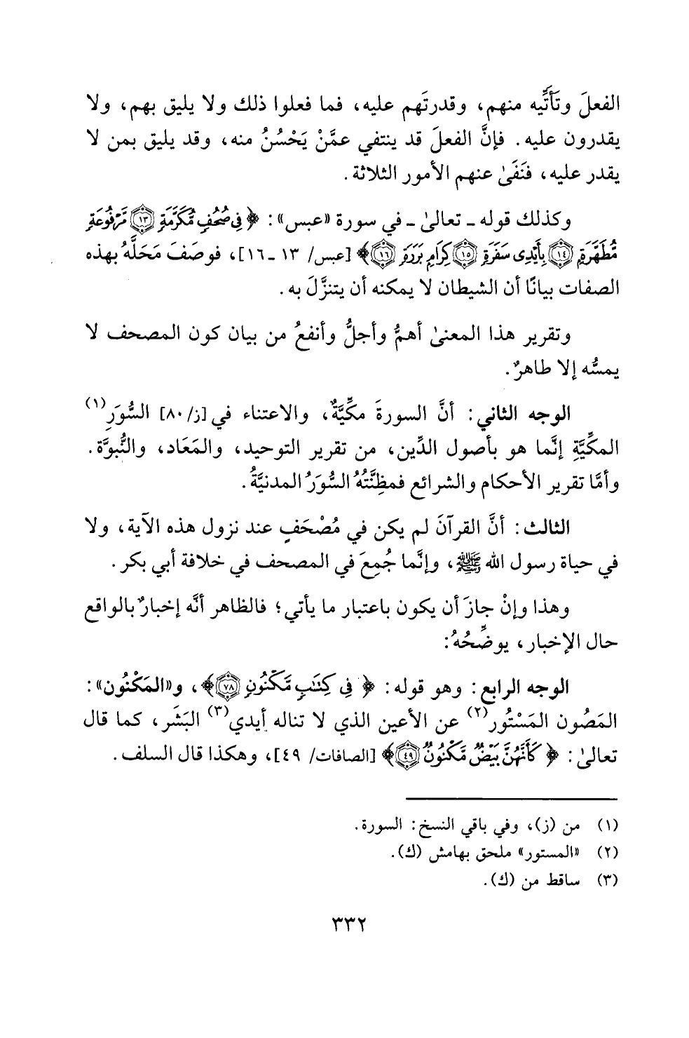 وكذلك قوله -تعالى- في سورة "عبس": {فِي صُحُفٍ مُكَرَّمَةٍ (13) مَرْفُوعَةٍ مُطَهَّرَةٍ (14) بِأَيْدِي سَفَرَةٍ (15) كِرَامٍ بَرَرَةٍ (16)} [عبس: 13 - 16]، فوصَفَ مَحَلَّهُ بهذه الصفات بيانًا أن الشيطان لا يمكنه أن يتنزَّلَ به.