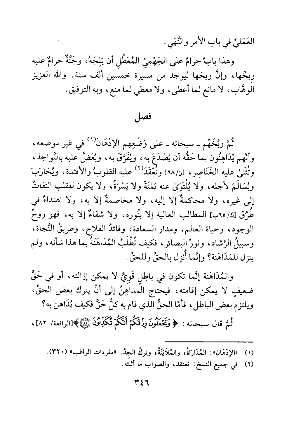 ثُمَّ وبَّخَهُم -سبحانه- على وَضْعِهم الإذهَانَ (¬1) في غير موضعه، وأنهم يُدَاهِنُون بما حَقُّه أن يُصْدَعَ به، ويُفَرَّقَ به، ويُعَضَّ عليه بالنَّواجذ، وتُثْنى عليه الخَنَاصِر، [ن/ 68] وتُعْقَدَ (¬2) عليه القلوبُ والأفئدة، ويُحَارَبَ ويُسَالَمَ لأجله، ولا يُلْتَوَى عنه يَمْنَةً ولا يَسْرَةً، ولا يكون للقلب التفاتٌ إلى غيره، ولا محاكمةٌ إلا إليه، ولا مخاصمةٌ إلا به، ولا اهتداءٌ في طُرُق [ك/65 ب] المطالب العالية إلا بنُوره، ولا شفاءٌ إلا به، فهو روحُ الوجود، وحياة العالم، ومدار السعادة، وقائدُ الفلاح، وطريقُ النجاة، وسبيلُ الرَّشاد، ونورُ البصائر، فكيف تُطْلَبُ المُدَاهَنَةُ بما هذا شأنه، ولم ينزل للمُدَاهَنة؟ وإنَّما أُنزل بالحقِّ وللحقِّ.