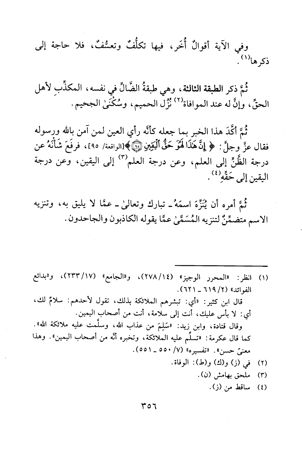 ثُمَّ أكَّدَ هذا الخبر بما جعله كأنَّه رأي العين لمن آمن بالله ورسوله فقال -عزَّ وجلَّ-: {إِنَّ هَذَا لَهُوَ حَقُّ الْيَقِينِ (95)} [الواقعة: 95]، فرفَعَ شَأْنَهُ عن درجة الظَّنِّ إلى العلم، وعن درجة العلم (¬3) إلى اليقين، وعن درجة اليقين إلى حَقِّهِ (¬4).