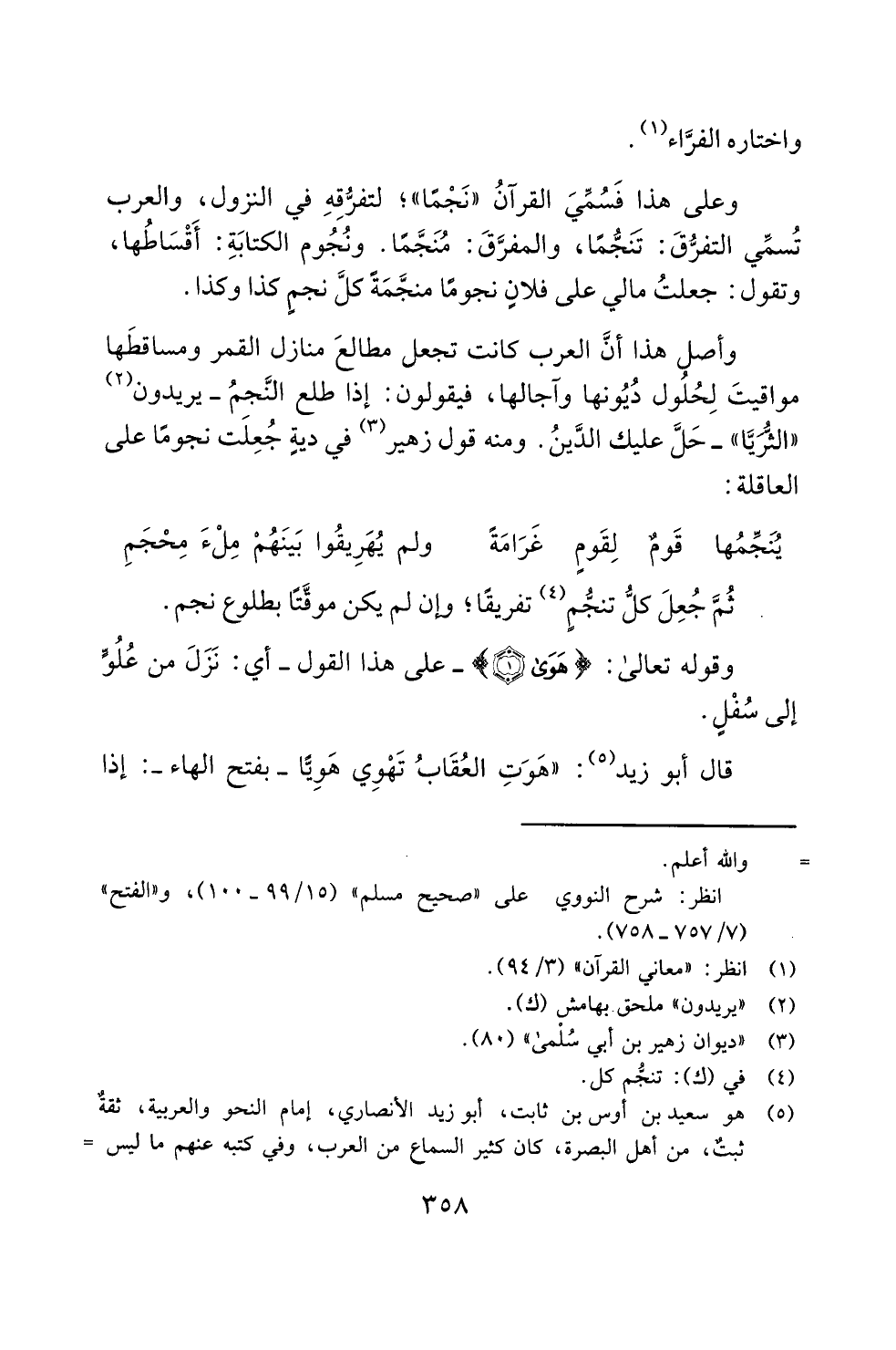 وعلى هذا فَسُمِّيَ القرآنُ "نَجْما"؛ لتفرُّقِهِ في النزول، والعرب تُسمِّي التفرُّقَ: تنَجُّمًا، والمفرَّقَ: مُنَجَّمَا. ونُجُوم الكتابَةِ: أَقْسَاطُها، وتقول: جعلتُ مالي على فلانٍ نجوفا منجَّمَة كلَّ نجمٍ كذا وكذا.