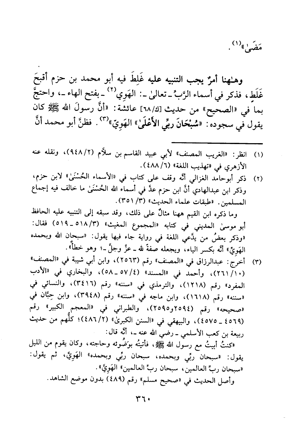 وما ذكره ابن القيم ههنا مثالٌ على ذلك، وقد سبقه إلى التنبيه عليه الحافظ أبو موسى المديني في كتابه "المجموع المغيث" (3/ 518 - 519) فقال: "وذكر بعضُ من يدَّعي اللغة في رواية جاء فيها يقول: "سبحان الله وبحمده الهَوِيِّ" أنَّه بكسر الياء، ويجعله صفةً لله -عزَّ وجلَّ-؛ وهو خطأٌ".
