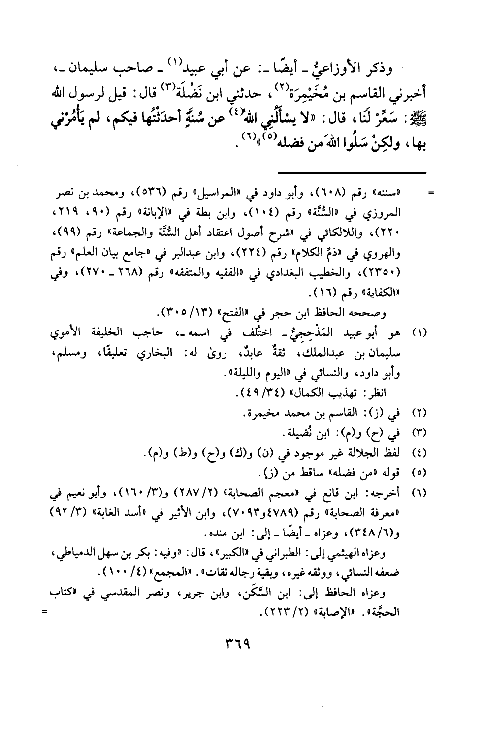 وذكر الأوزاعيُّ -أيضًا-: عن أبي عبيد (¬1) -صاحب سليمان-، أخبرني القاسم بن مُخَيْمِرَة (¬2)، حدثني ابن نَضْلَة (¬3) قال: قيل لرسول الله - صلى الله عليه وسلم - سَعِّرْ لَنَا، قال: "لا يسْألنِي الله (¬4) عن سُنَّة أحدَثْتُها فيكم، لم يَأمُرْني بها، ولكِنْ سَلُوا اللهَ من فضله (¬5) " (¬6).
