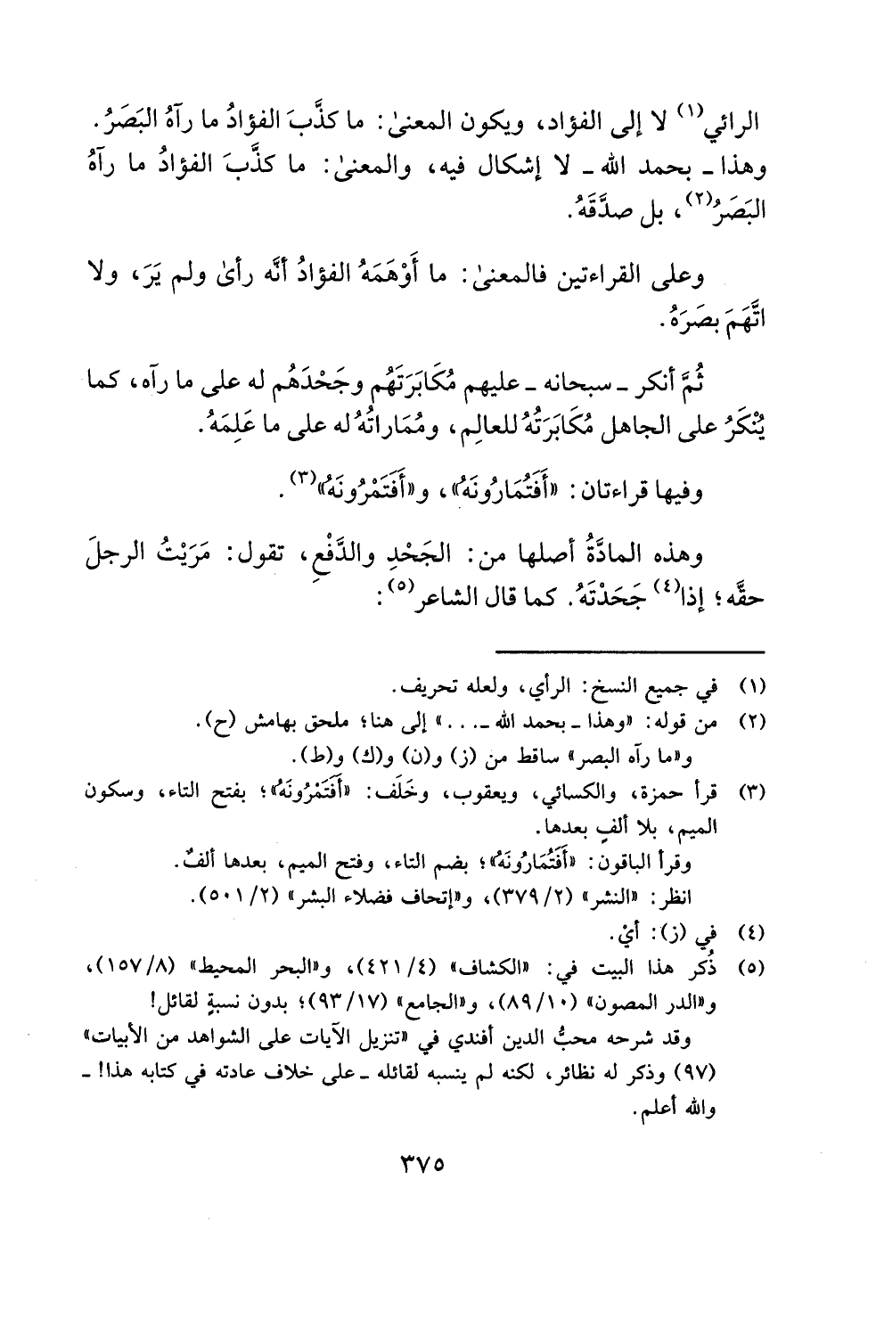 ثُمَّ أنكر -سبحانه- عليهم مُكَابَرَتَهُم وجَحْدَهُم له على ما رآه، كما يُنْكَرُ على الجاهل مُكَابَرَتُهُ للعالِم، ومُمَاراتُهُ له على ما عَلِمَهُ.