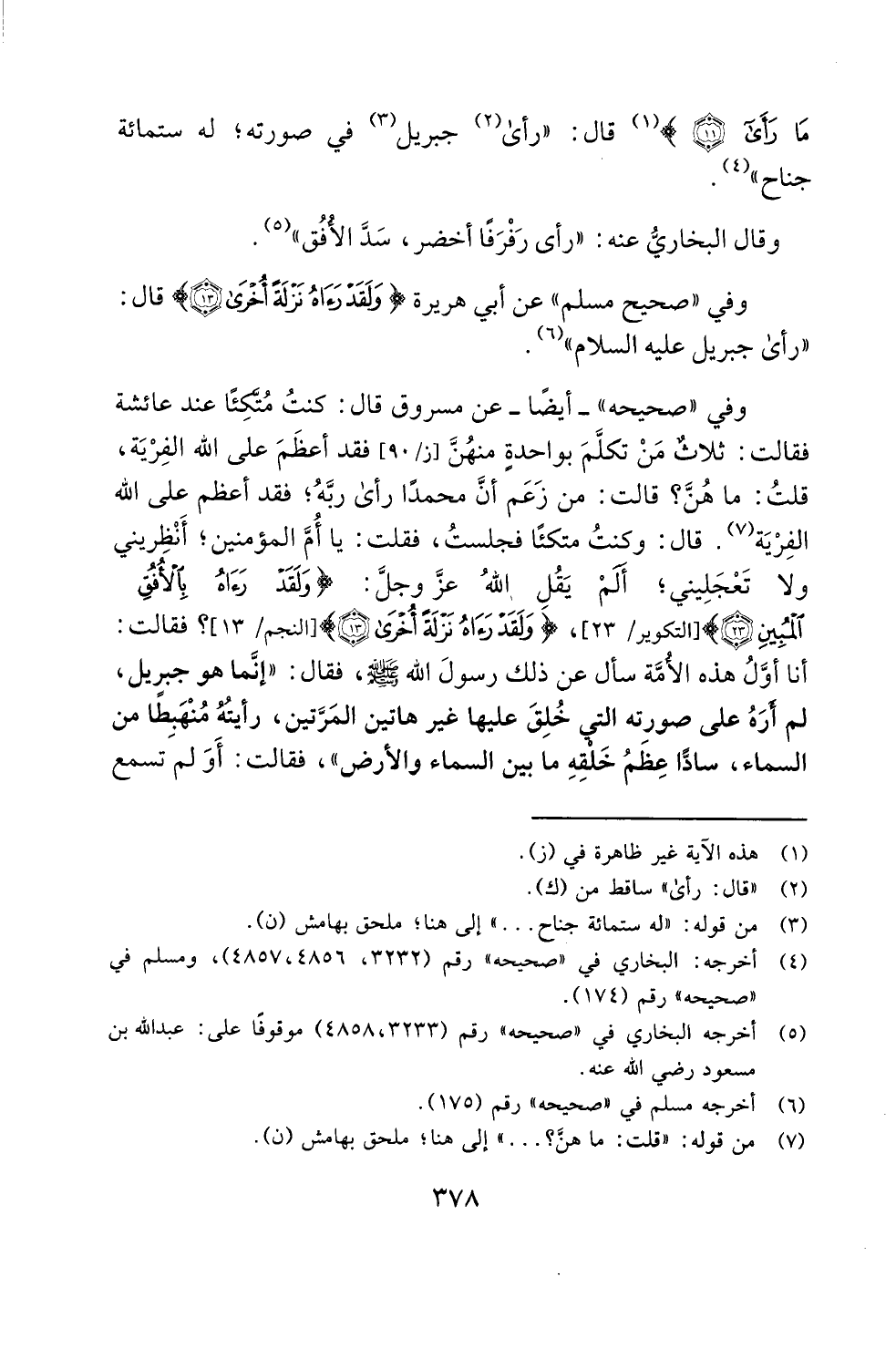 وفي "صحيحه" -أيضًا- عن مسروق قال: كنتُ مُتَّكِئًا عند عائشة فقالت: ثلاثٌ مَنْ تكلَّمَ بواحدةِ منهُنَّ [ز/ 90] فقد أعظَمَ على الله الفِرْيَة، قلتُ: ما هُنَّ؟ قالت: من زَعَم أنَّ محمدًا رأى ربَّهُ؛ فقد أعظم على الله الفِرْيَة (¬7). قال: وكنتُ متكئًا فجلستُ، فقلت: يا أُمَّ المؤمنين؛ أَنْظِريني ولا تَعْجَلِيني؛ ألمْ يَقُلِ اللهُ عزَّ وجلَّ: {وَلَقَدْ رَآهُ بِالْأُفُقِ الْمُبِينِ (23)} [التكوير: 23]، {وَلَقَدْ رَآهُ نَزْلَةً أُخْرَى (13)} [النجم/ 13]؟ فقالت: أنا أوَّلُ هذه الأُمَّة سأل عن ذلك رسولَ الله - صلى الله عليه وسلم -، فقال: "إنَّما هو جبريل، لم أَرَهُ على صورته التي خُلِقَ عليها غير هاتين المَرَّتين، رأيتُهُ مُنْهَبِطًا من السماء، سادًّا عِظَمُ خَلقِهِ ما بين السماء والأرض"، فقالت: أَوَ لم تسمع