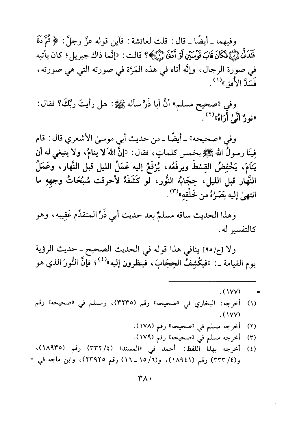 وفي "صحيحه" -أيضًا- من حديث أبي موسى الأشعري قال: قام فِينَا رسولُ الله - صلى الله عليه وسلم - بخمس كلماتٍ، فقال: "إنَّ اللهَ لا ينامُ، ولا ينبغي له أن يَنَامَ، يَخفِضُ القِسْطَ ويرفَعُه، يُرْفَعُ إليه عَمَلُ الليل قبل النَّهار، وعَمَلُ النَّهار قبل الليل، حِجَابُه النُّور، لو كشَفَهُ لأحرقت سُبُحَاتُ وجهِهِ ما انتهى إليه بَصَرُهُ من خَلْقِهِ" (¬3).