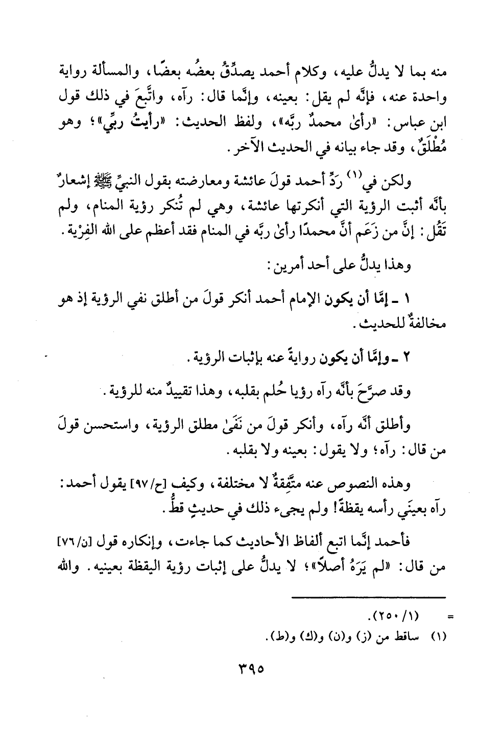 1 - إمَّا أن يكون الإمام أحمد أنكر قولَ من أطلق نفي الرؤية إذ هو مخالفةٌ للحديث.
