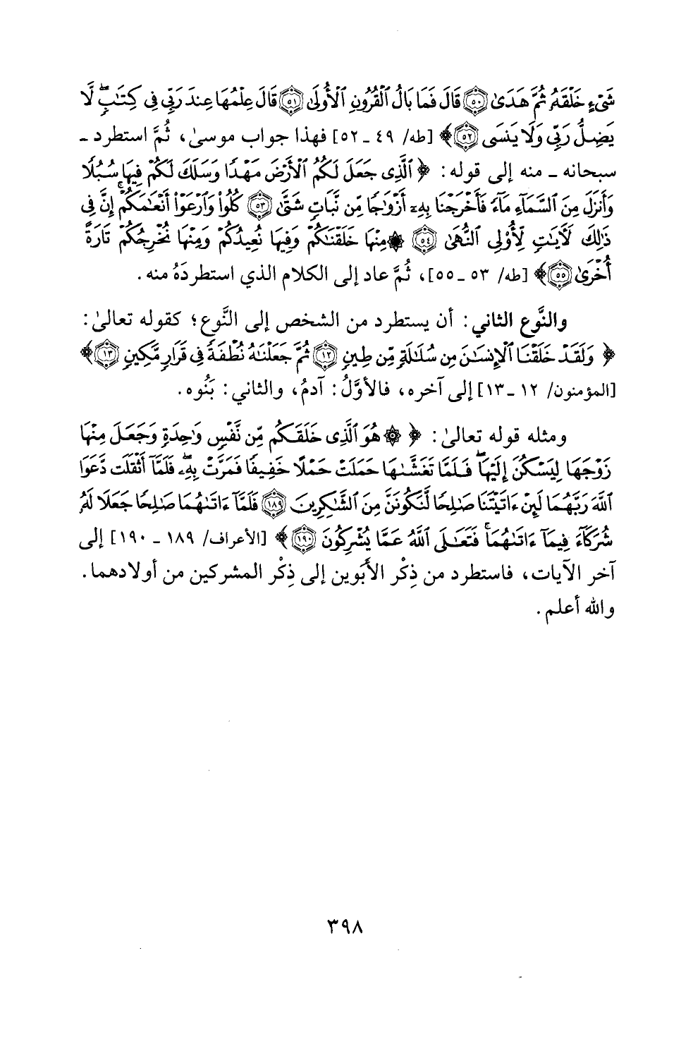 شَيْءٍ خَلْقَهُ ثُمَّ هَدَى (50) قَالَ فَمَا بَالُ الْقُرُونِ الْأُولَى (51) قَالَ عِلْمُهَا عِنْدَ رَبِّي فِي كِتَابٍ لَا يَضِلُّ رَبِّي وَلَا يَنْسَى (52)} [طه/ 49 - 52] فهذا جواب موسى، ثُمَّ استطرد - سبحانه- منه إلى قوله: {الَّذِي جَعَلَ لَكُمُ الْأَرْضَ مَهْدًا وَسَلَكَ لَكُمْ فِيهَا سُبُلًا وَأَنْزَلَ مِنَ السَّمَاءِ مَاءً فَأَخْرَجْنَا بِهِ أَزْوَاجًا مِنْ نَبَاتٍ شَتَّى (53) كُلُوا وَارْعَوْا أَنْعَامَكُمْ إِنَّ فِي ذَلِكَ لَآيَاتٍ لِأُولِي النُّهَى (54) مِنْهَا خَلَقْنَاكُمْ وَفِيهَا نُعِيدُكُمْ وَمِنْهَا نُخْرِجُكُمْ تَارَةً أُخْرَى (55)} [طه/ 53 - 55]، ثُمَّ عاد إلى الكلام الذي استطردَهُ منه.