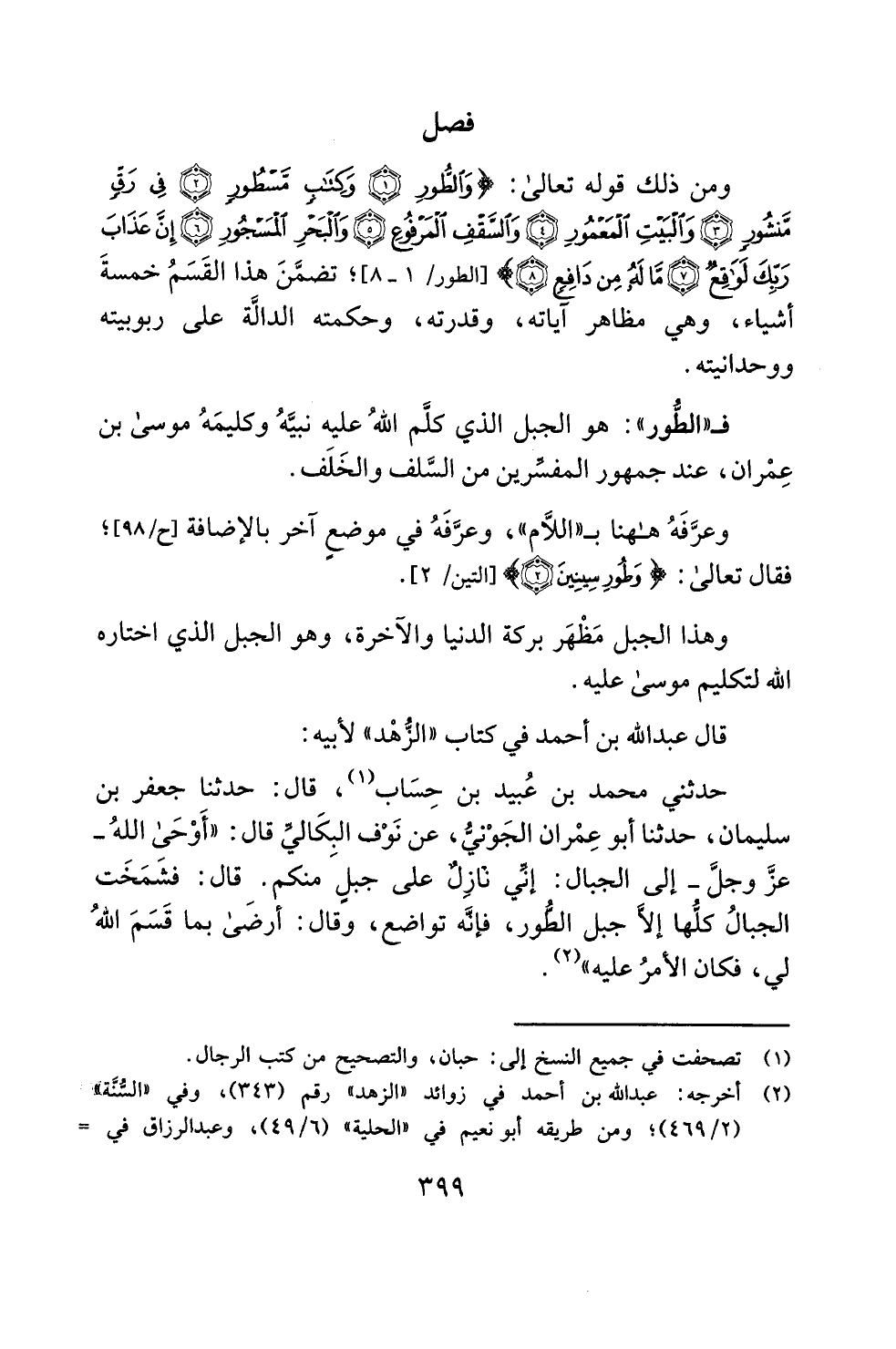 وعرَّفَهُ هاهنا بـ "اللاَّم"، وعرَّفَهُ في موضعٍ آخر بالإضافة [ح/98]؛ فقال تعالى: {وَطُورِ سِينِينَ (2)} [التين: 2].