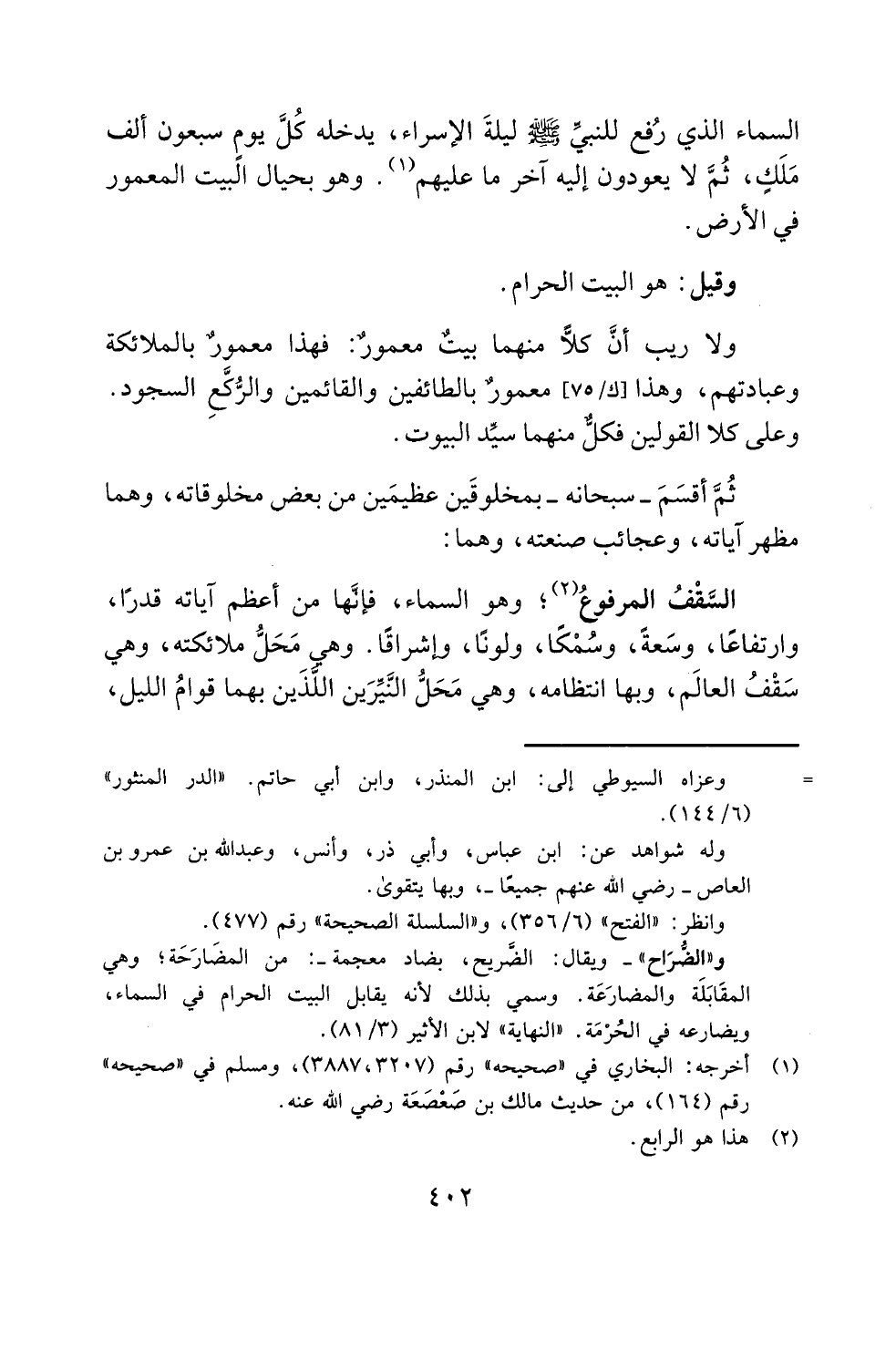 و"الضُّرَاح" - ويقال: الضَّريح، بضاد معجمة-: من المضَارَحَة؛ وهي المقَابَلَة والمضارَعَة. وسمي بذلك لأنه يقابل البيت الحرام في السماء، ويضارعه في الحُرْمَة. "النهاية" لابن الأثير (3/ 81).