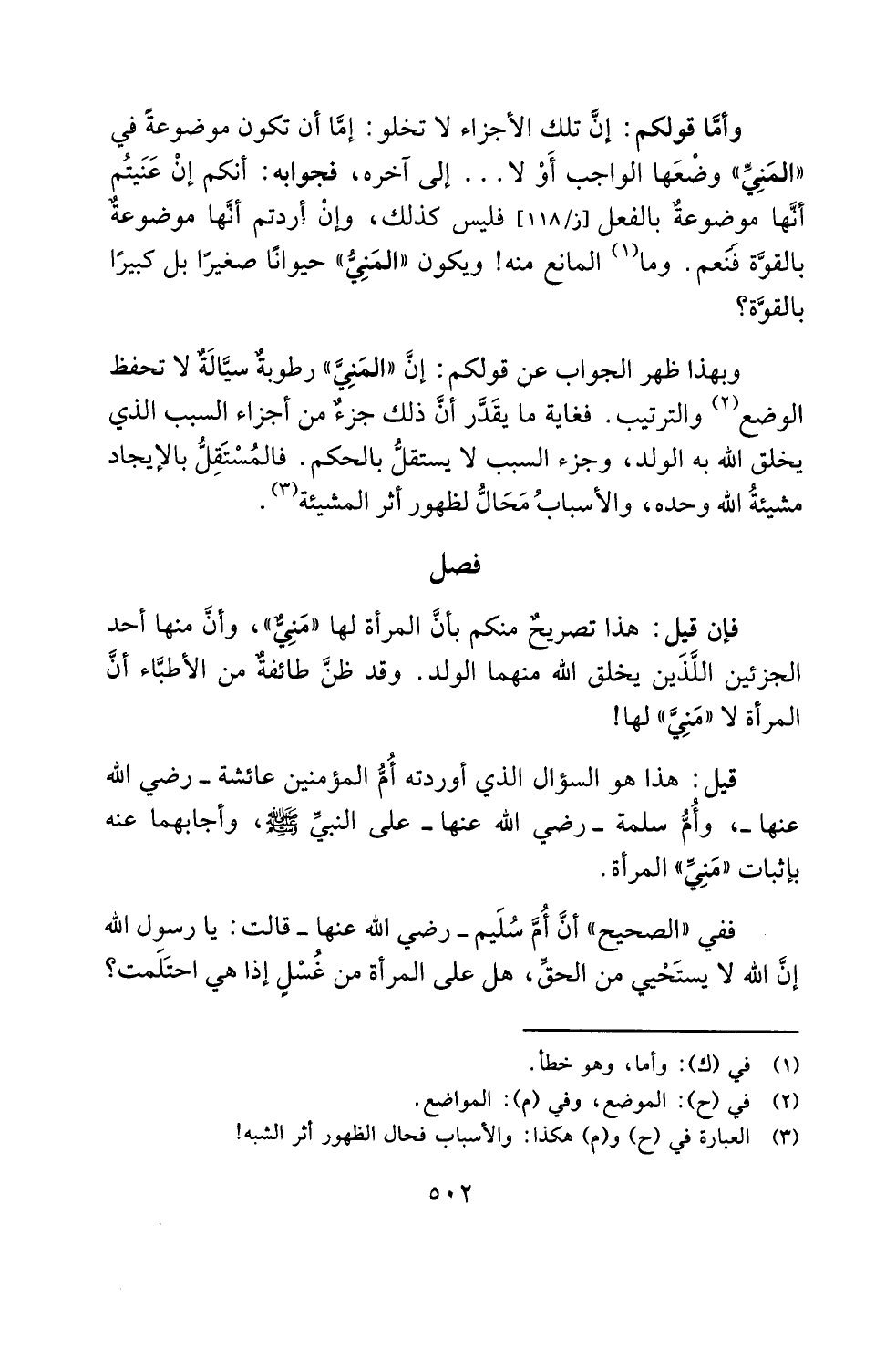 وبهذا ظهر الجواب عن قولكم: إنَّ "المَنِيَّ" رطوبةٌ سيَّالَةٌ لا تحفظ الوضع (¬2) والترتيب. فغاية ما يقَدَّر أنَّ ذلك جزءٌ من أجزاء السبب الذي يخلق الله به الولد، وجزء السبب لا يستقلُّ بالحكم. فالمسْتَقِلُّ بالإيجاد مشيئةُ الله وحده، والأسبابُ مَحَالُّ لظهور أثر المشيئة (¬3).