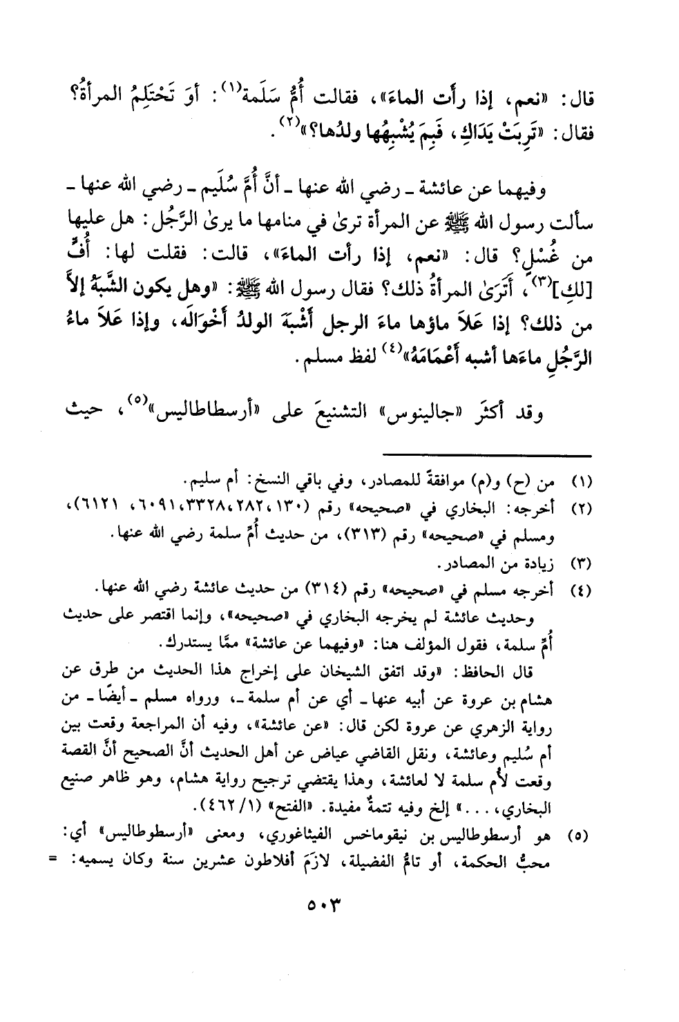 قال الحافظ: "وقد اتفق الشيخان على إخراج هذا الحديث من طرق عن هشام بن عروة عن أبيه عنها -أي عن أم سلمة-، ورواه مسلم -أيضًا- من رواية الزهري عن عروة لكن قال: "عن عائشة"، وفيه أن المراجعة وقعت بين أم سُليم وعائشة، ونقل القاضي عياض عن أهل الحديث أنَّ الصحيح أنَّ القصة وقعت لأُم سلمة لا لعائشة، وهذا يقتضي ترجيح رواية هشام، وهو ظاهر صنيع البخاري، ... " إلخ وفيه تتمةٌ مفيدة. "الفتح" (1/ 462).