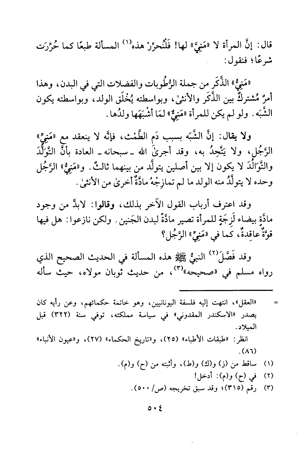 قال: إنَّ المرأة لا "مَنِيَّ" لها! فَلْنُحرِّرْ هذه (¬1) المسألة طبعًا كما حُرِّرَت شرعًا؛ فنقول: