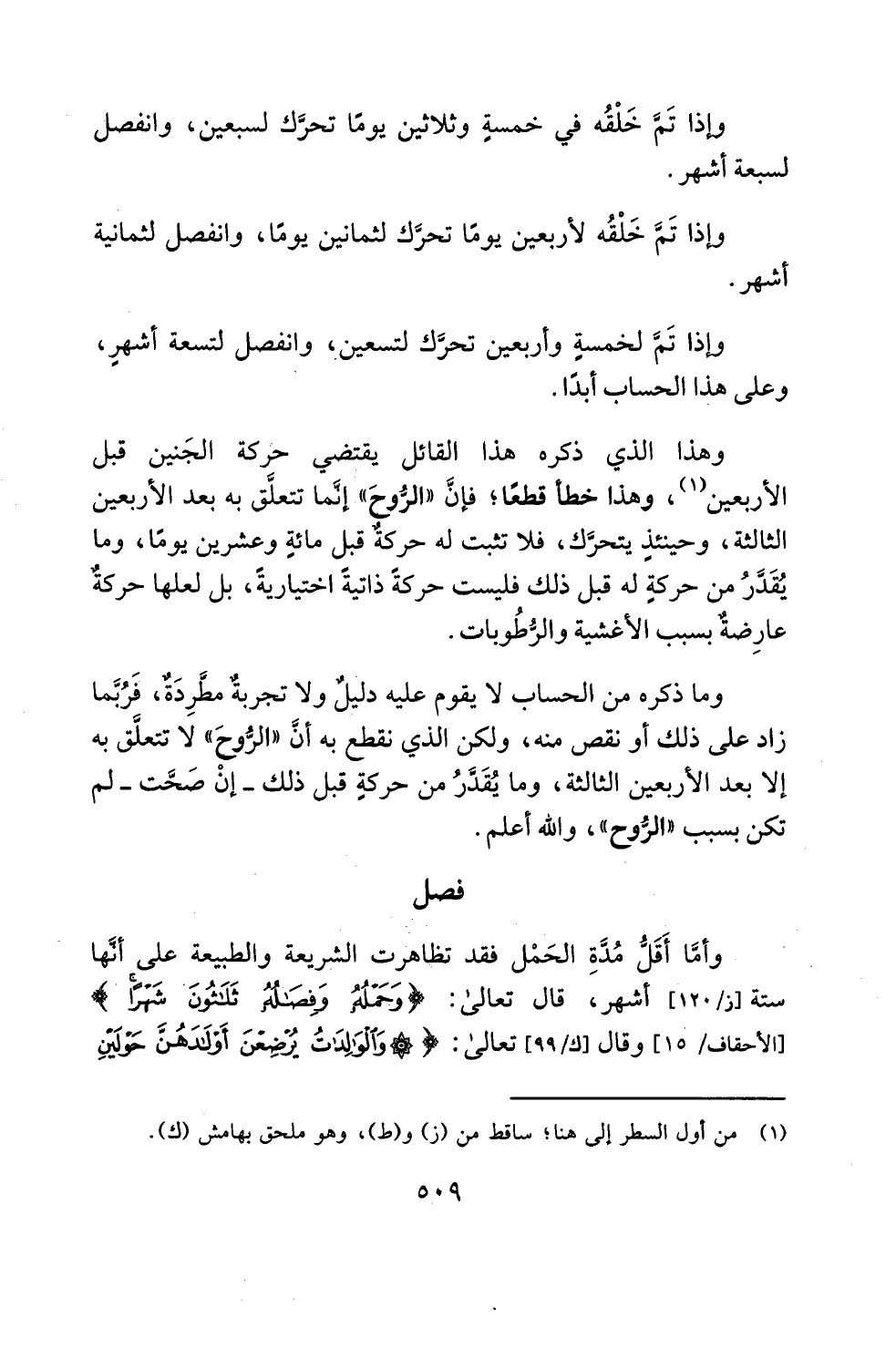 وهذا الذي ذكره هذا القائل يقتضي حركة الجَنين قبل الأربعين (¬1)، وهذا خطأ قطعًا؛ فإنَّ "الرُّوحَ" إنَّما تتعلَّق به بعد الأربعين الثالثة، وحينئذٍ يتحرَّك، فلا تثبت له حركةٌ قبل مائةٍ وعشرين يومًا، وما يُقَدَّرُ من حركةٍ له قبل ذلك فليست حركةً ذاتيةً اختياريةً، بل لعلها حركةٌ عارِضةٌ بسبب الأغشية والرُّطُوبات.