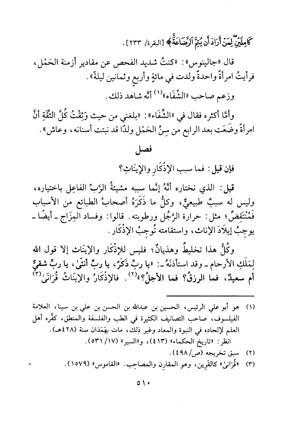قيل: الذي نختاره أنَّهُ إنَّما سببه مشيئةُ الرَّبِّ الفاعِل باختياره، وِليس له سببٌ طبيعيٌّ، وكل ما ذَكَرَهُ أصحابُ الطبائع من الأسباب فمُنْتَقِضٌ؛ مثل: حرارة الرَّجُل ورطوبته. قالوا: وفساد المِزَاج -أيضًا- يوجِبُ إيلَادَ الإناث، واستقامته تُوجِبُ الإذْكَار.