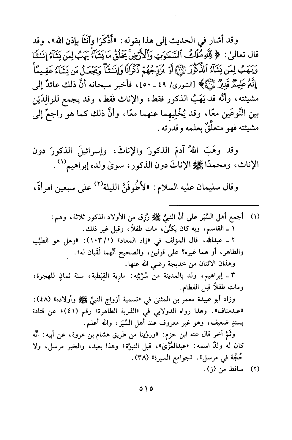 وقد وهَبَ اللهُ آدمَ الذكورَ والإناثَ، وإسرائيلَ الذكورَ دون الإناث، ومحمدًا - صلى الله عليه وسلم - الإناثَ دون الذكور، سوى ولده إبراهيم (¬1).