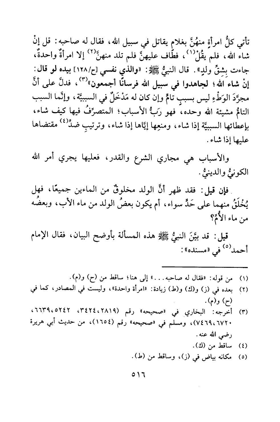تأتي كلُّ امرأةٍ منهُنَّ بغلامٍ يقاتل في سبيل الله، فقال له صاحبه: قل إنْ شاء الله، فلم يقُلْ (¬1)، فطاف عليهنَّ فلم تلد منهنَّ (¬2) إلا امرأةٌ واحدةٌ، جاءت بشِق ولدٍ". قال النبيُّ - صلى الله عليه وسلم -: "والذي نفسي، بيده لو قال: إنْ شاءَ الله؛ لجاهدوا في سبيل الله فرسانًا أجمعون" (¬3)، فدلَّ على أنَّ مجرَّدَ الوَطْءِ ليس بسببٍ تامٍّ وإن كان له مَدْخَلٌ في السببيَّة، وإنَّما السبب التالم مشيئة الله وحده، فهو رَبُّ الأسباب؛ المتصرِّفُ فيها كيف شاء، بإعطائها السببيَّة إذا شاء، ومنعِها إيَّاها إذا شاء، وترتيبِ ضدِّ (¬4) مقتضاها عليها إذا شاء.