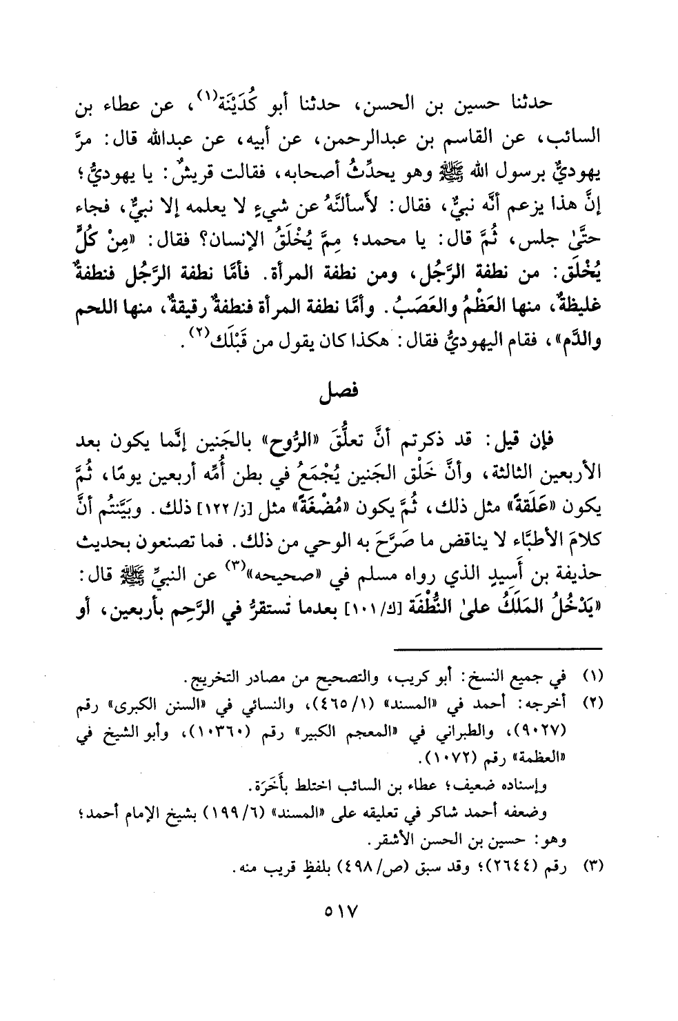 حدثنا حسين بن الحسن، حدثنا أَبو كُدَيْنَة (¬1)، عن عطاء بن السائب، عن القاسم بن عبد الرحمن، عن أبيه، عن عبد الله قال: مرَّ يهوديٌّ برسول الله - صلى الله عليه وسلم -وهو يحدِّثُ أصحابه، فقالت قريشٌ: يا يهوديُّ؛ إنَّ هذا يزعم أنَّه نبيٌّ، فقال: لأَسألتَّهُ عن شيءٍ لا يعلمه إلا نبيٌّ، فجاء حتَّى جلس، ثُمَّ قال: يا محمد؛ مِمَّ يُخْلَقُ الإنسان؟ فقال: "مِنْ كُلٍّ يُخْلَق: من نطفة الرَّجُل، ومن نطفة المرأة. فأَمَّا نطفة الرَّجُل فنطفةٌ غليظةٌ، منها العَظْمُ والعَصَبُ. وأمَّا نطفة المرأة فنطفةٌ رقيقةٌ، منها اللحم والدَّم"، فقام اليهوديُّ فقال: هكذا كان يقول من قَبْلَك (¬2).