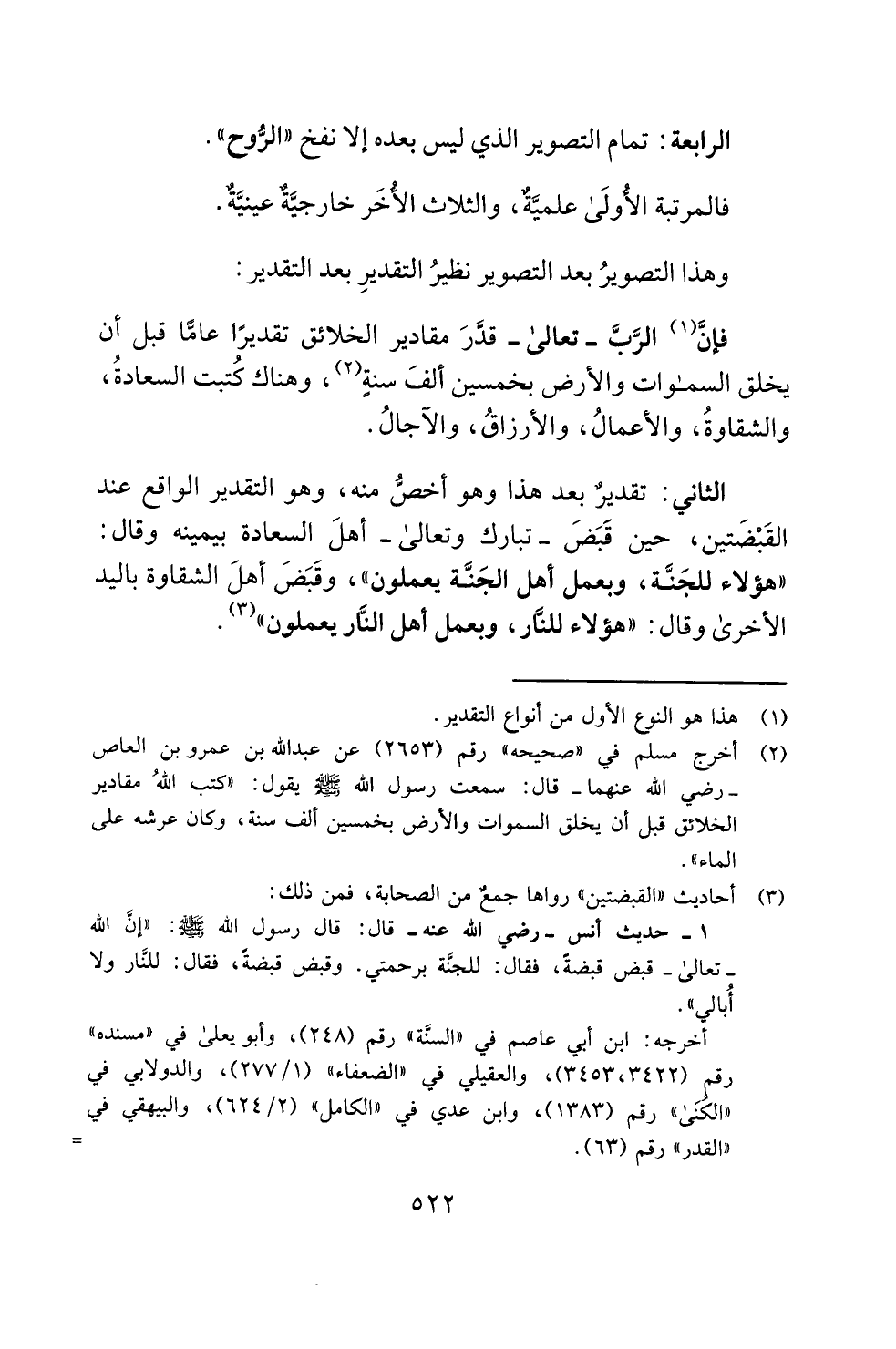 الثاني: تقديرٌ بعد هذا وهو أخصُّ منه، وهو التقدير الواقع عند القَبْضَتين، حين قَبَضَ -تبارك وتعالى- أهلَ السعادة بيمينه وقال: "هؤلاء للجَنَّة، وبعمل أهل الجَنَّة يعملون"، وقَبَضَ أهلَ الشقاوة باليد الأخرى وقال: "هؤلاء للنَّار، وبعمل أهل النَّار يعملون" (¬3).