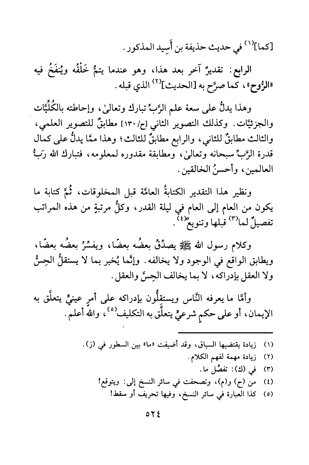 الرابع: تقديرٌ آخر بعد هذا، وهو عندما يتمُّ خَلْقُه ويُنفَخُ فيه "الرُّوح"، كما صرَّح به [الحديث] (¬2) الذي قبله.