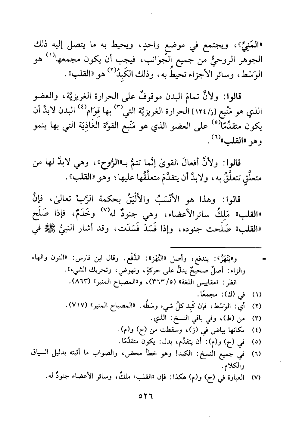 "المَنِيِّ"، ويجتمع في موضعٍ واحدٍ، ويحيط به ما يتصل إليه ذلك الجوهر الروحيُّ من جميع الجوانب، فيجب أن يكون مجمعها (¬1) هو الوَسْط، وسائر الأجزاء تحيطُ به، وذلك الكَبِدُ (¬2) هو "القلب".