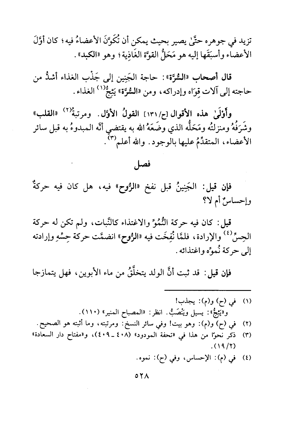 وأَوْلَى هذه الأقوال [ح/ 131] القولُ الأوَّل. ومرتبةُ (¬2) "القلب" وشَرَفُهُ ومنزلتُه ومَحَلُّه الذي وضَعَهُ الله به يقتضي أنَّه المبدوءُ به قبل سائر الأعضاء، المتقدِّمُ عليها بالوجود. والله أعلم (¬3).