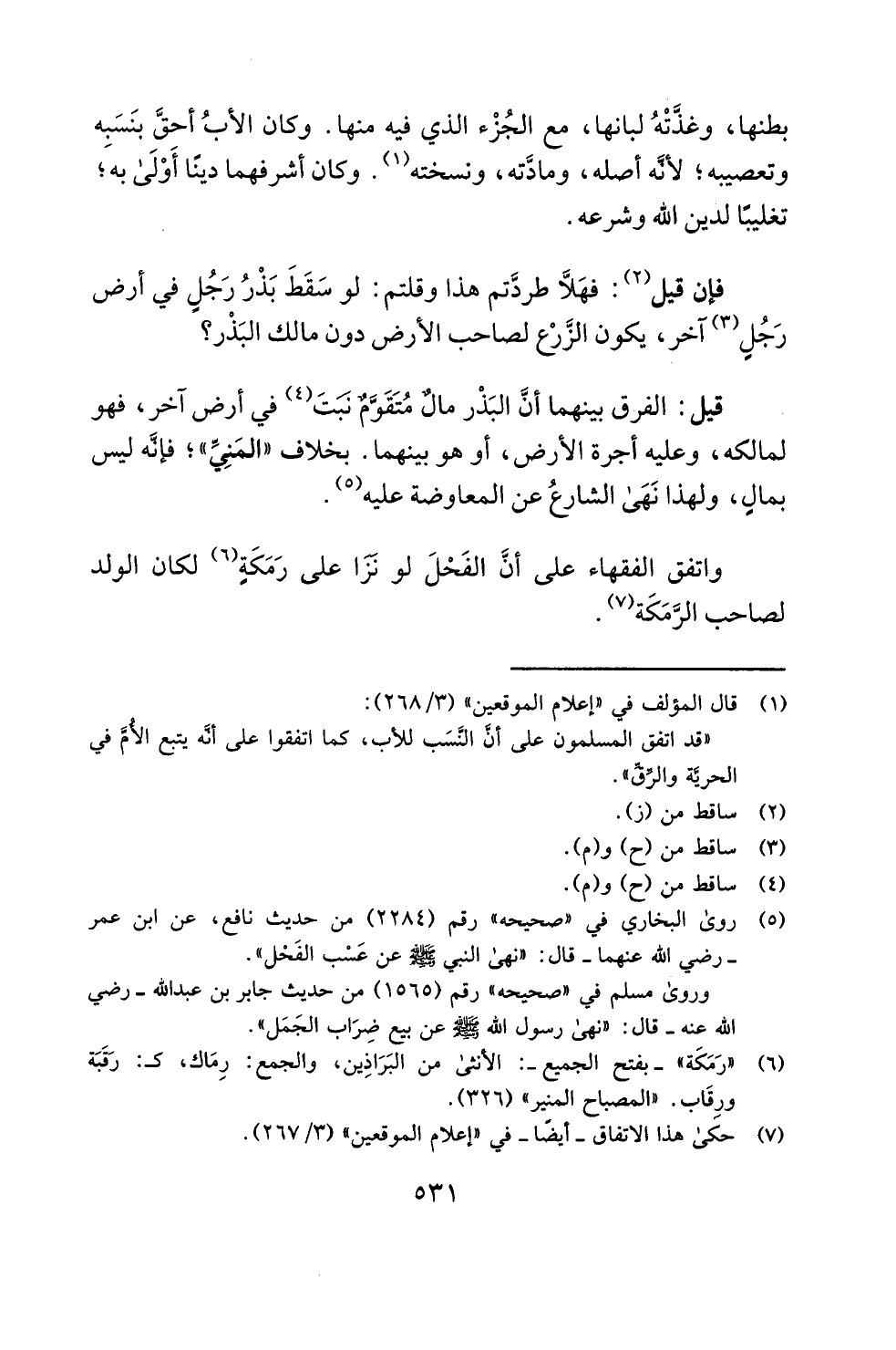قيل: الفرق بينهما أنَّ البَذْر مالٌ مُتَقَوَّمٌ نَبَتَ (¬4) في أرض آخر، فهو لمالكه، وعليه أجرة الأرض، أو هو بينهما. بخلاف "المَنِيِّ"؛ فإنَّه ليس بمالٍ، ولهذا نَهَى الشارعُ عن المعاوضة عليه (¬5).