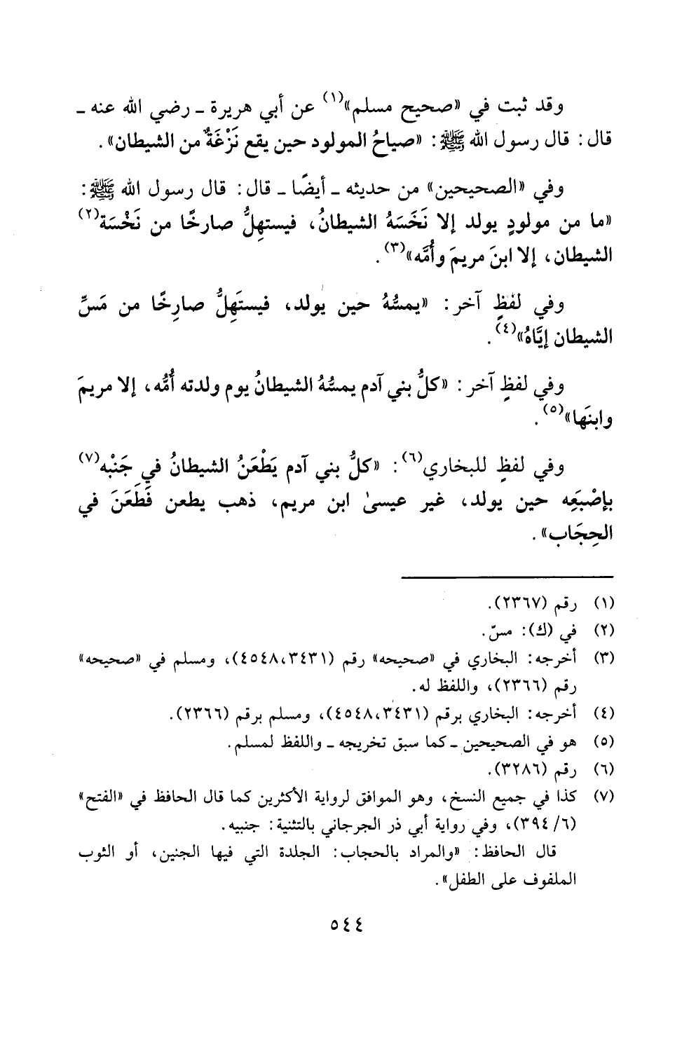 وفي "الصحيحين" من حديثه -أيضًا- قال: قال رسول الله - صلى الله عليه وسلم -: "ما من مولودٍ يولد إلا نَخَسَهُ الشيطانُ، فيستهِلُّ صارخًا من نَخْسَة (¬2) الشيطان، إلا ابنَ مريمَ وأُمَّه" (¬3).