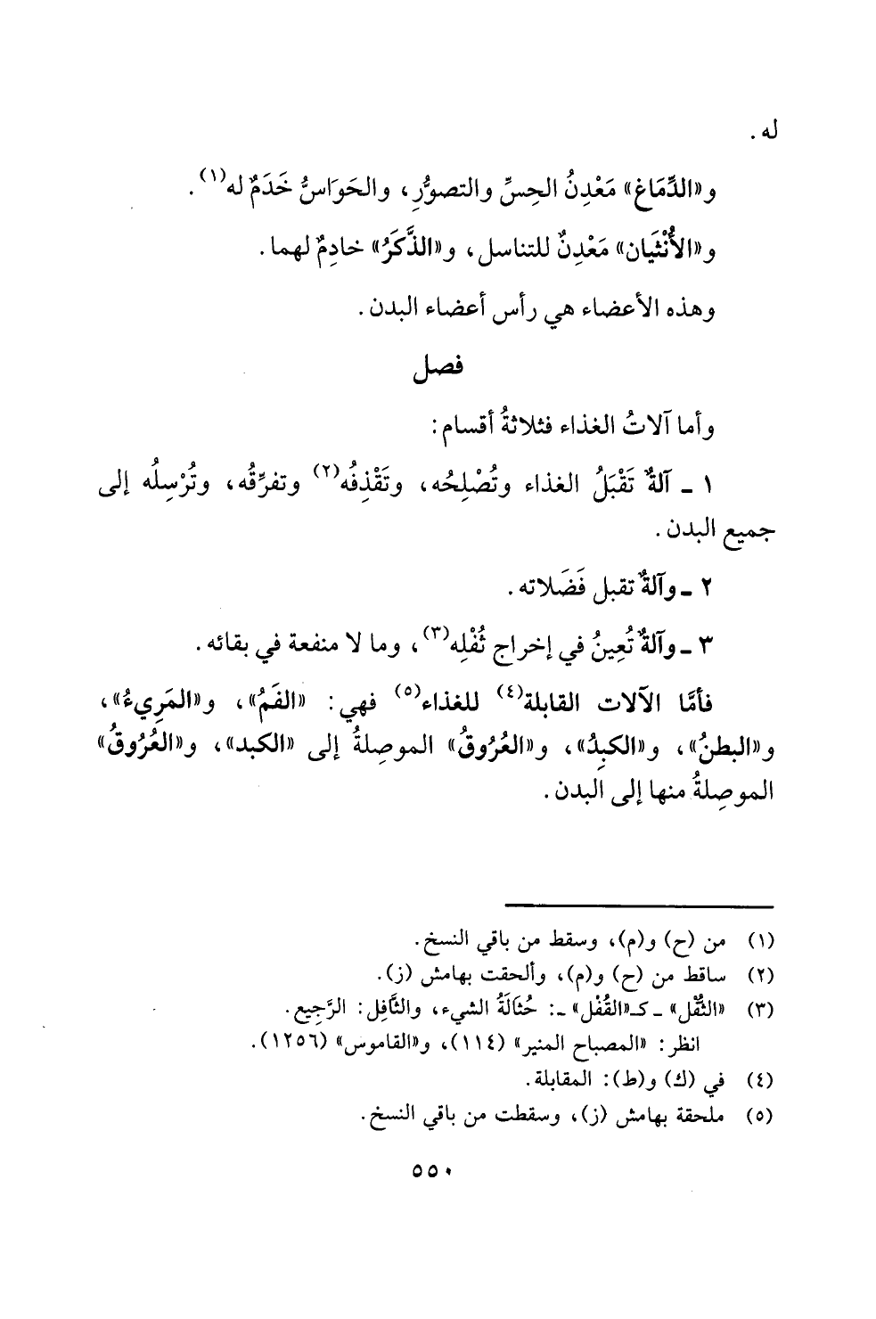 فأمَّا الآلات القابلة (¬4) للغذاء (¬5) فهي: "الفَمُ"، و"المَرِيءُ"، و"البطنُ"، و"الكبِدُ"، و"العُرُوقُ" الموصِلةُ إلى "الكبد"، و"العُرُوقُ" الموصِلةُ منها إلى البدن.