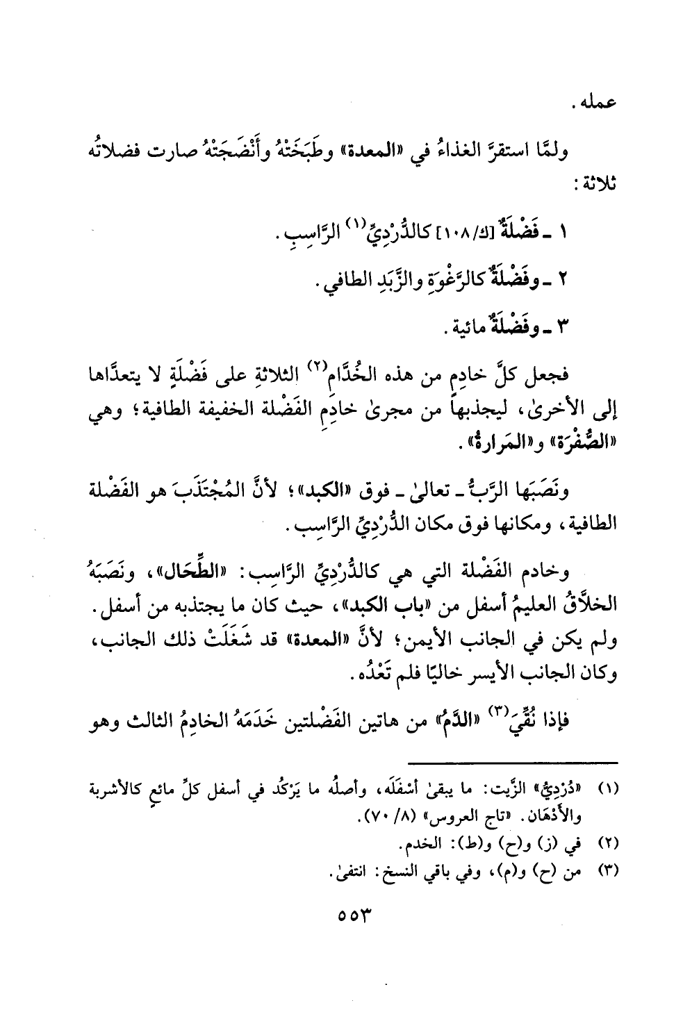 فجعل كلَّ خادِمٍ من هذه الخُدَّامِ (¬2) الثلاثةِ على فَضْلَةٍ لا يتعدَّاها إلى الأخرى، ليجذبها من مجرى خادِمِ الفَضْلة الخفيفة الطافية؛ وهي "الصُّفْرَة" و"المَرارةُ".
