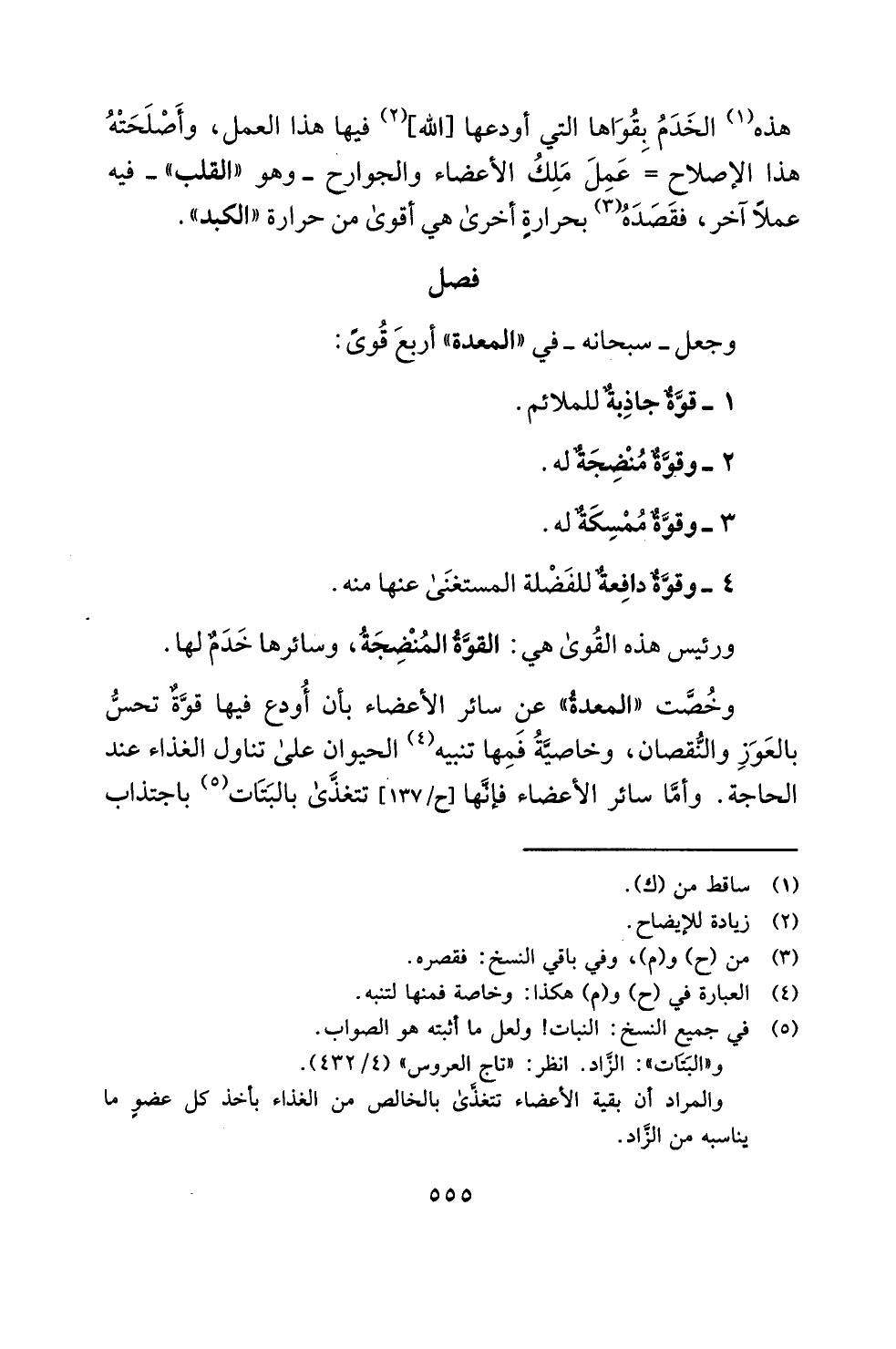 وخُصَّت "المعدةُ" عن سائر الأعضاء بأن أُودع فيها قوَّةٌ تحسُّ بالعَوَزِ والنُّقصان، وخاصيَّةُ فَمِها تنبيه (¬4) الحيوان على تناول الغذاء عند الحاجة. وأمَّا سائر الأعضاء فإنَّها [ح/ 137] تتغذَّى بالبَتَات (¬5) باجتذاب