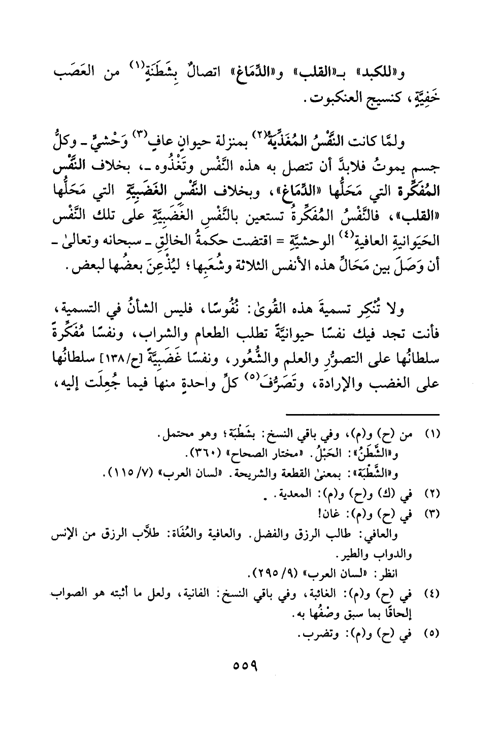 ولمَّا كانت النَّفْسُ المُغَذِّيَةُ (¬2) بمنزلة حيوانٍ عافٍ (¬3) وَحْشيٍّ -وكلُّ جسم يموتُ فلابدَّ أن تتصل به هذه النَّفْس وتَغْذُوه-، بخلاف النَّفْس المُفَكِّرة التي مَحَلُّها "الدِّمَاغ"، وبخلاف النَّفْسِ الغَضَبِيَّةِ التي مَحَلُّها "القلب"، فالنَّفْسُ المُفَكِّرةُ تستعين بالنَّفْسِ الغَضَبِيَّةِ على تلك النَّفْس الحَيَوانيةِ العافيةِ (¬4) الوحشيَّةِ = اقتضت حكمةُ الخالِقِ -سبحانه وتعالى- أن وَصَلَ بين مَحَالِّ هذه الأنفس الثلاثة وشُعَبِها؛ ليُذْعِنَ بعضُها لبعض.