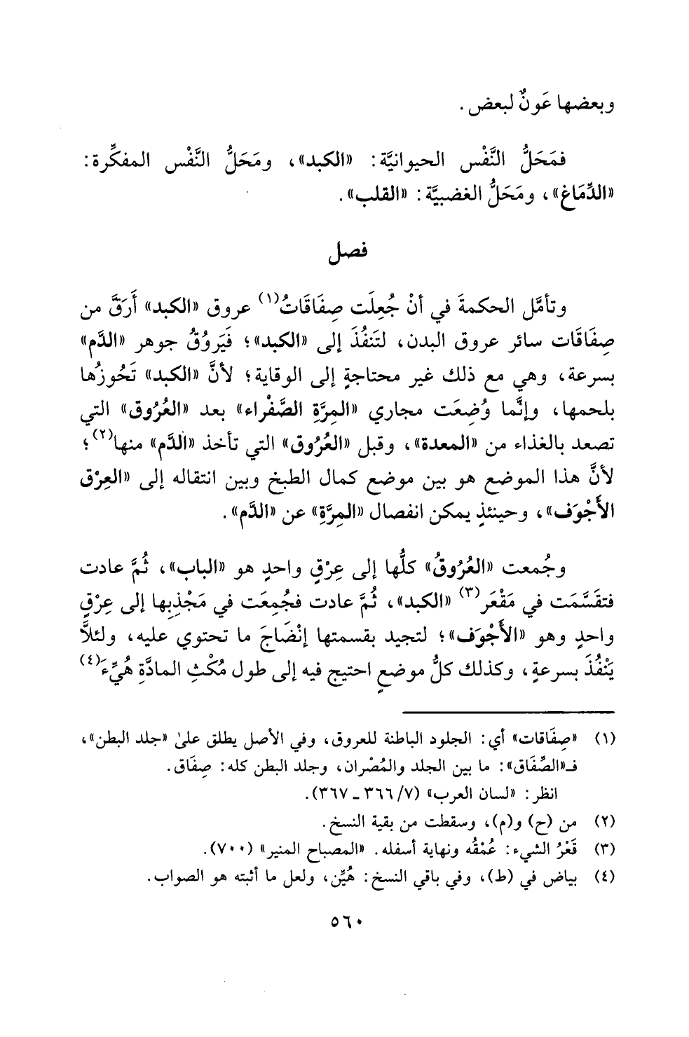 وتأمَّل الحكمةَ في أنْ جُعِلَت صِفَاقَاتُ (¬1) عروق "الكبد" أَرَقَّ من صِفَاقَات سائر عروق البدن، لتَنفُذَ إلى "الكبد"؛ فَيَروُقُ جوهر "الدَّم" بسرعة، وهي مع ذلك غير محتاجةٍ إلى الوقاية؛ لأنَّ "الكبد" تَحُوزُها بلحمها، وإنَّما وُضِعَت مجاري "المِرَّةِ الضَفْراء" بعد "العُرُوق" التي تصعد بالغذاء من "المعدة"، وقبل "العُرُوق" التي تأخذ "الدَّم" منها (¬2)؛ لأنَّ هذا الموضع هو بين موضع كمال الطبخ وبين انتقاله إلى "العِرْق الأَجْوَف"، وحينئذٍ يمكن انفصال "المِرَّةِ" عن"الدَّم".
