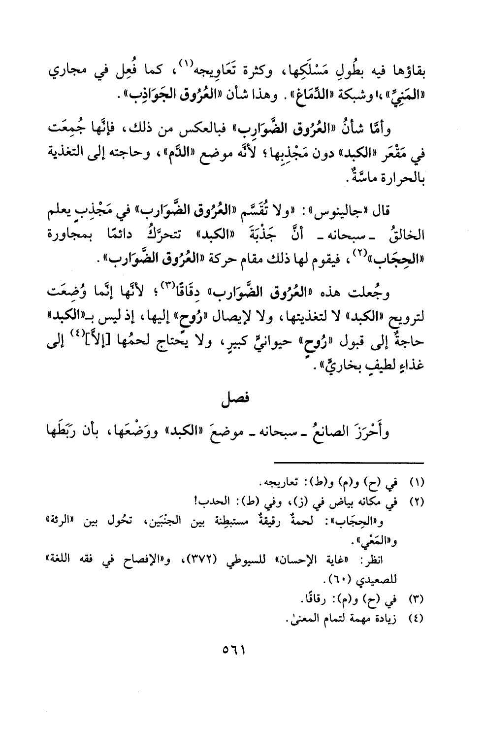 وجُعلت هذه "العُرُوق الضَّوَارب" دِقَاقًا (¬3)؛ لأنَّها إنَّما وُضِعَت لترويح "الكبد" لا لتغذيتها، ولا لإيصال "رُوحٍ" إليها، إذ ليس بـ"الكبد" حاجةٌ إلى قبول "رُوحٍ" حيوانيٍّ كبيرٍ، ولا يحتاج لحمُها [إلَّا] (¬4) إلى غذاءٍ لطيفٍ بخاريٍّ".