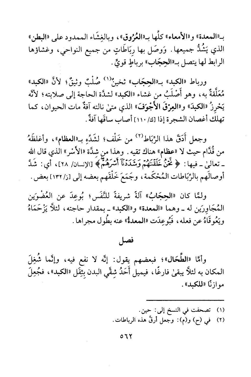 ورباط "الكبد" بـ"الحِجَاب" ثخينٌ (¬1) صُلْبٌ وثيقٌ؛ لأنَّ "الكبد" مُعَلَّقةٌ به، وهو أَصْلَبُ من غشاء "الكبد" لشدَّة الحاجة إلى صلابته؛ لأنَّه يَحْرِزُ "الكبدَ" و"العِرْقَ الأَجْوَفَ" الذي متى نالته آفةٌ مات الحيوان، كما تهلك أغصان الشجرة إذا [ك/ 110] أصاب ساقَها آفةٌ.
