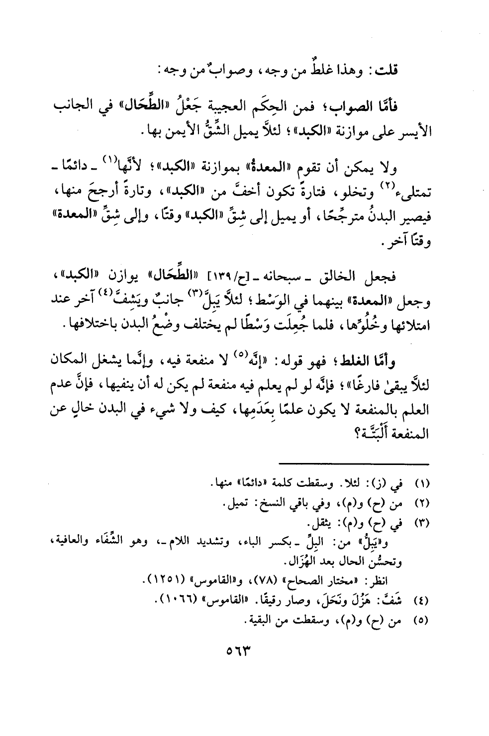 فجعل الخالق -سبحانه-[ح/ 139] "الطِّحَال" يوازن "الكبد"، وجعل "المعدة" بينهما في الوَسْط؛ لئلَّا يَبِلَّ (¬3) جانبٌ ويَشِفَّ (¬4) آخر عند امتلائها وخُلُوِّها، فلما جُعِلَت وَسْطًا لم يختلف وضْعُ البدن باختلافها.